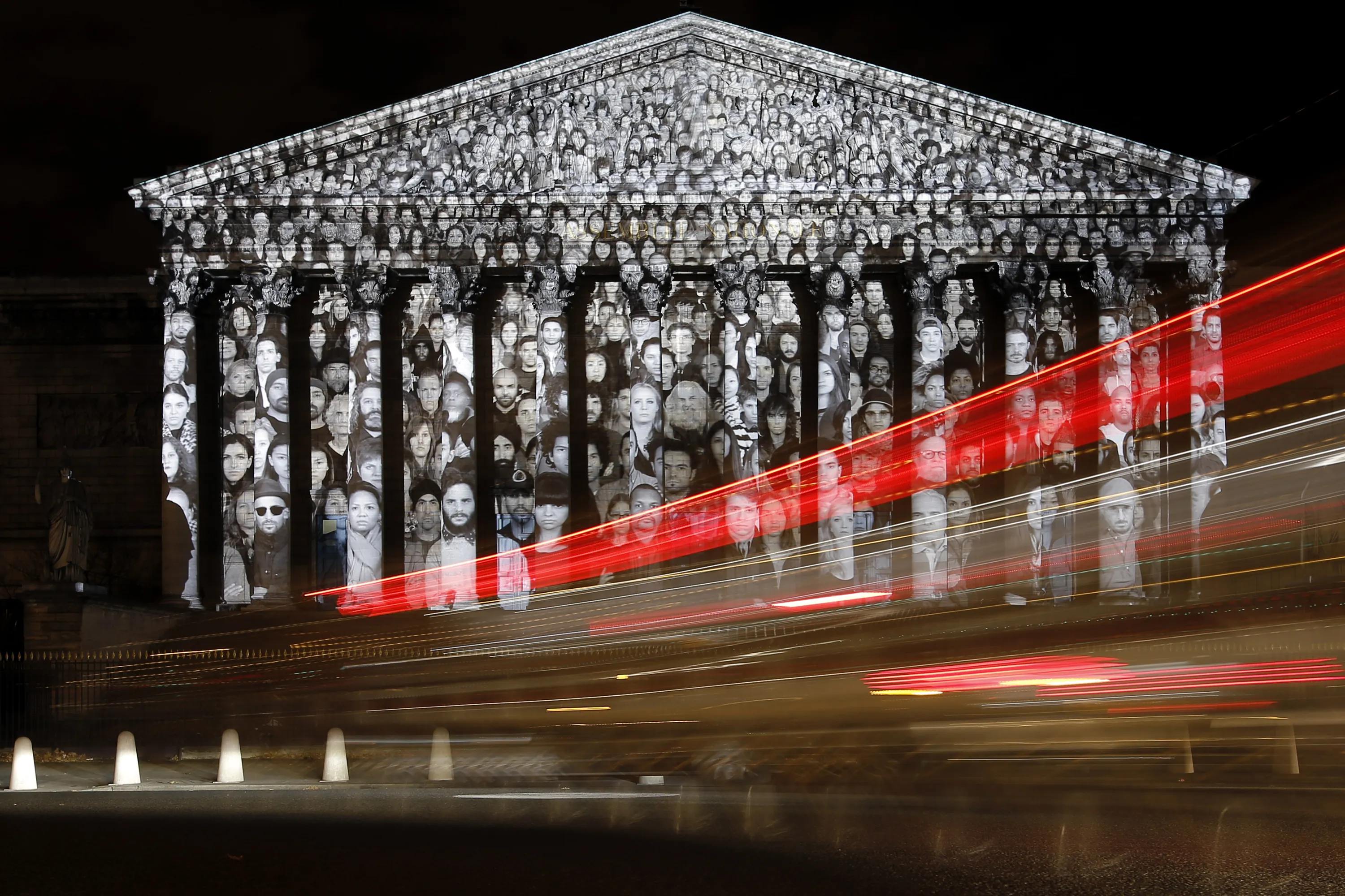 Cars pass by the national assembly in Paris, where a projection of French artist JR is displayed as part of the 2015 Paris Climate Conference, Sunday, November 29, 2015. More than 140 world leaders are gathering in Paris for high-stakes climate talks that start Monday, and activists are holding marches and protests around the world to urge them to reach a strong agreement to slow global warming. (Photo by Laurent Cipriani/AP Photo)