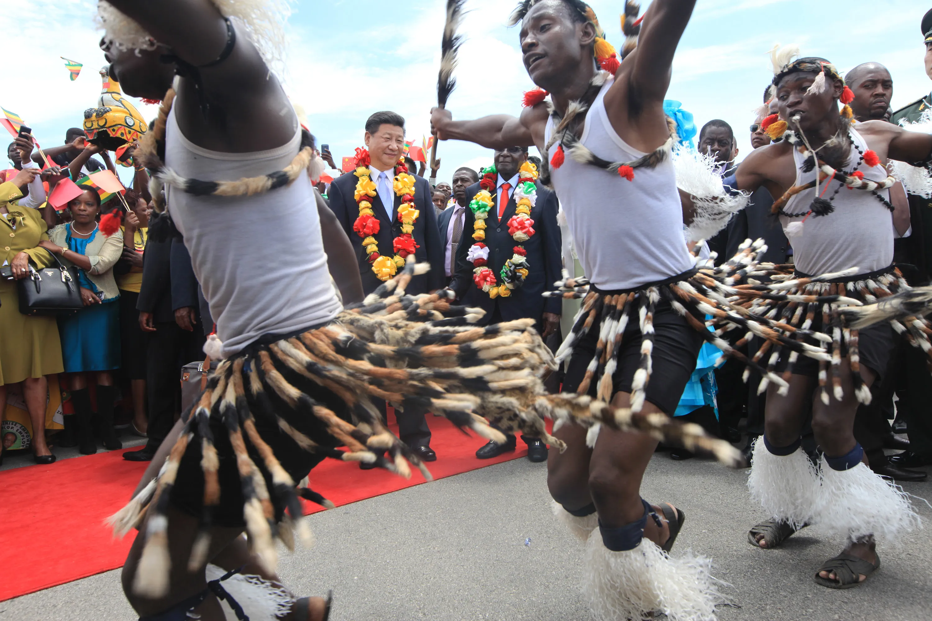 Chinese President Xi Jinping, centre, and Zimbabwean President Robert Mugabe, centre right, watch a performance by Zimbabwean traditional dancers upon his arrival in Harare, Zimbabwe, Tuesday, December 1. 2015. Jinping is in Zimbabwe for a two day State visit during which he is set to sign some bilateral agreements aimed at strengthening relationships between the two countries. (Photo by Tsvangirayi Mukwazhi/AP Photo)