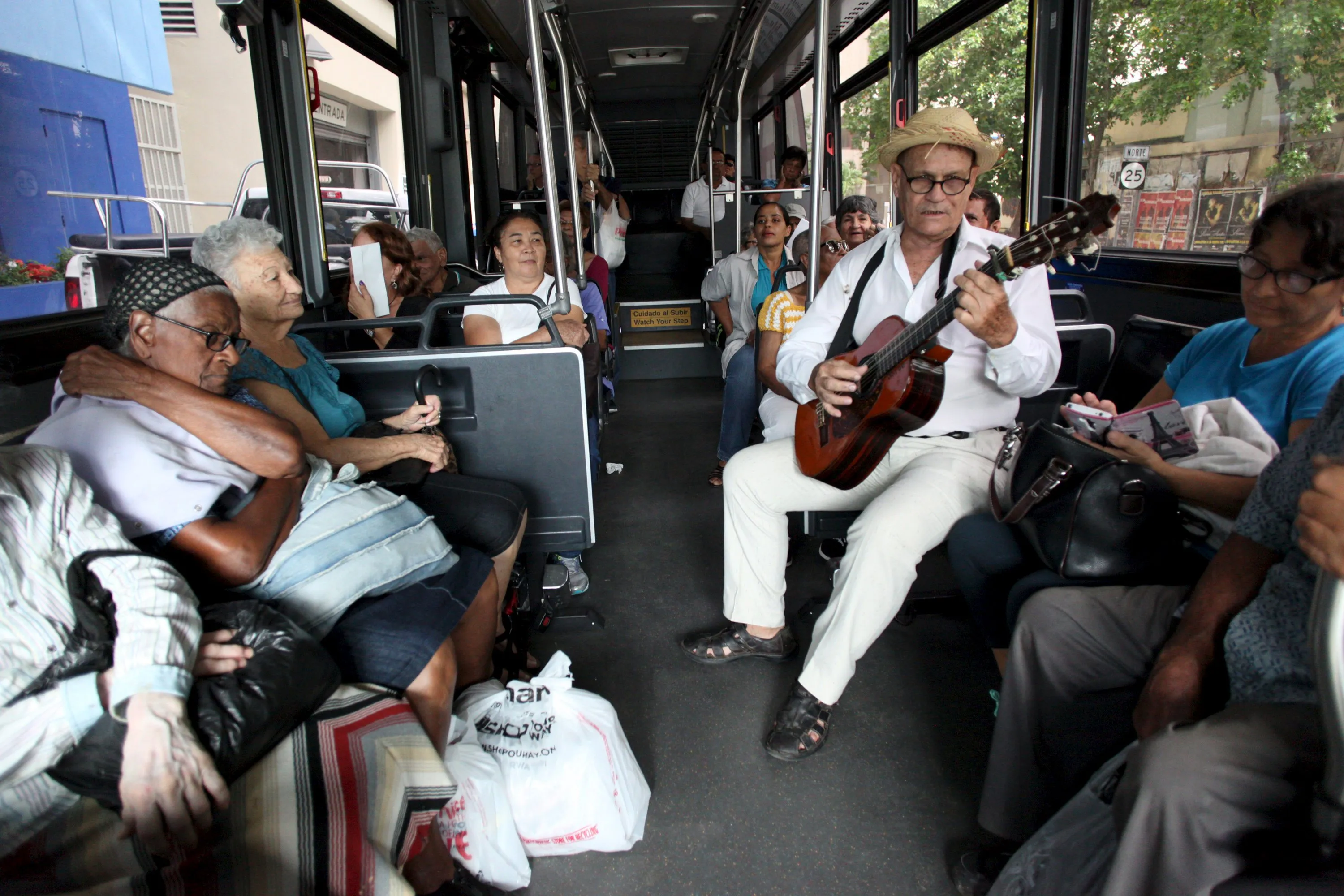 Jorge Luis Jimenez (2nd R) plays the guitar for passengers on a public bus in San Juan, December 2, 2015. Puerto Rico made a crucial debt payment on Tuesday but warned that its deteriorating finances could trigger future defaults, as the governor granted the U.S. territory power to take revenues from public agencies. (Photo by Alvin Baez/Reuters)