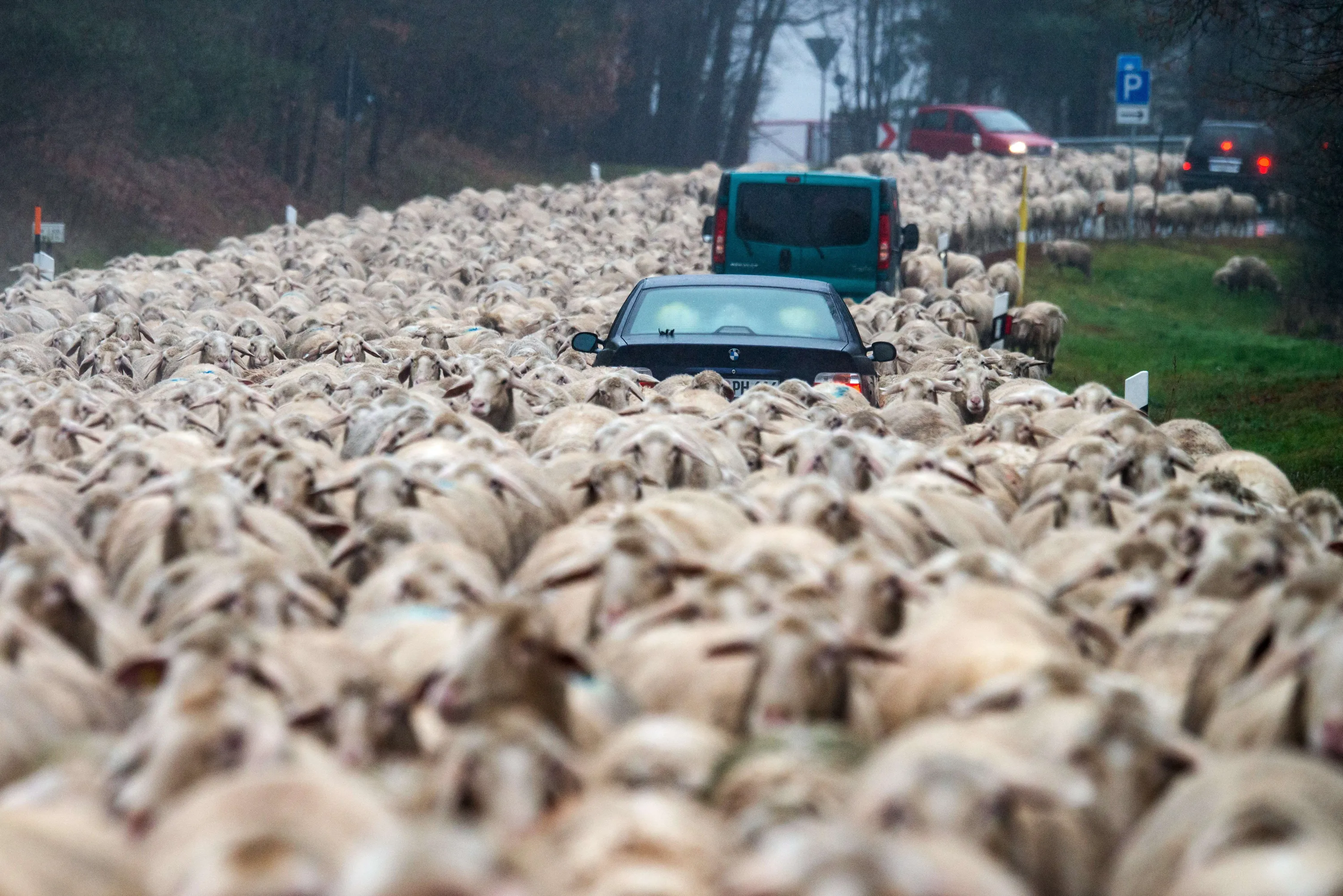 Cars stuck in a flock of sheep being driven across a street to another meadow near Bad Koetzting, southern Germany, on December 1, 2015. (Photo by Armin Weigel/AFP Photo/DPA)