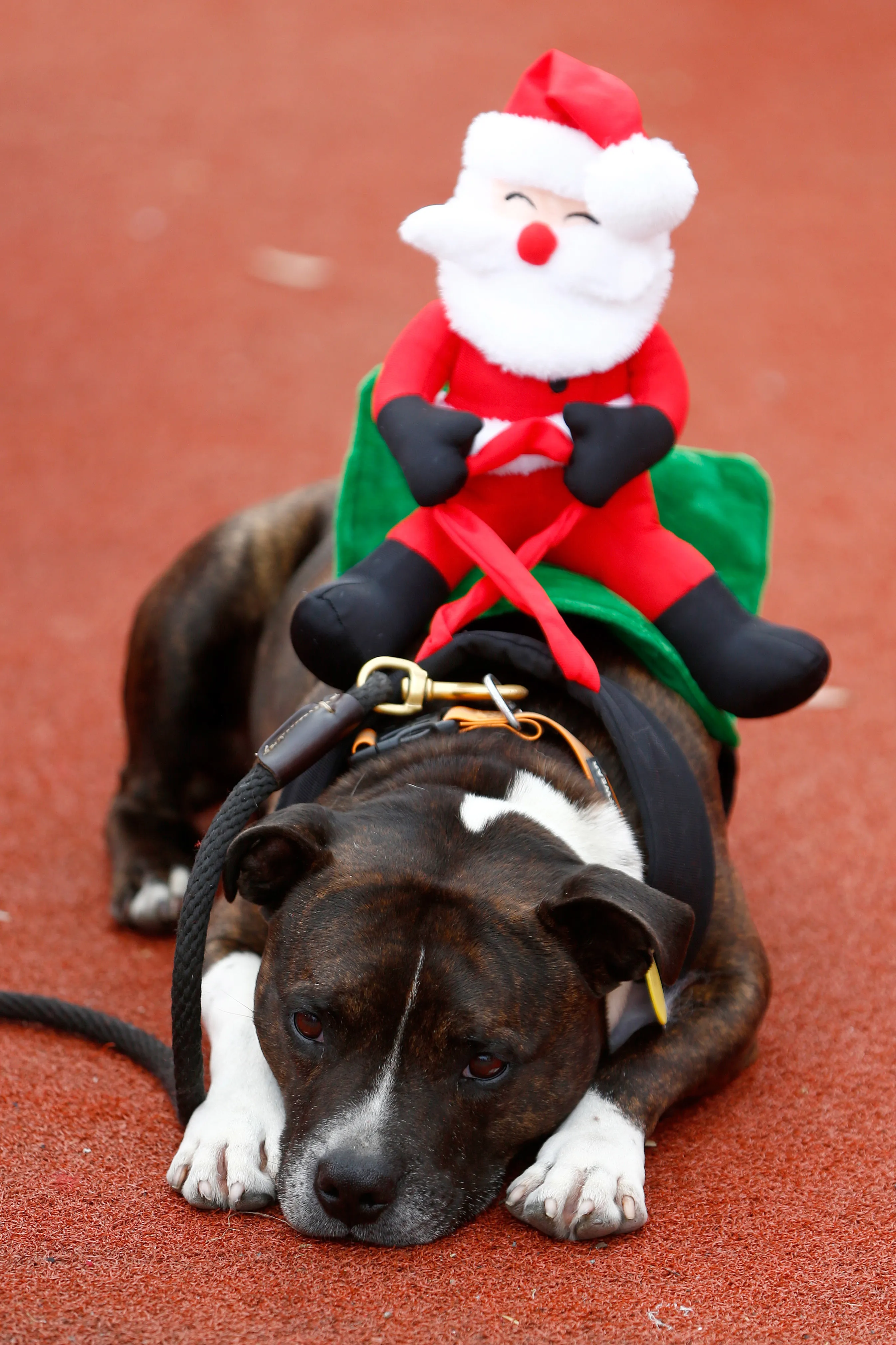 A dog wearing a soft toy Santa rests on Queens Wharf before the annual KidsCan Santa Fun Run on December 2, 2015 in Auckland, New Zealand. The annual event takes place in 18 venues across New Zealand. (Photo by Phil Walter/Getty Images)
