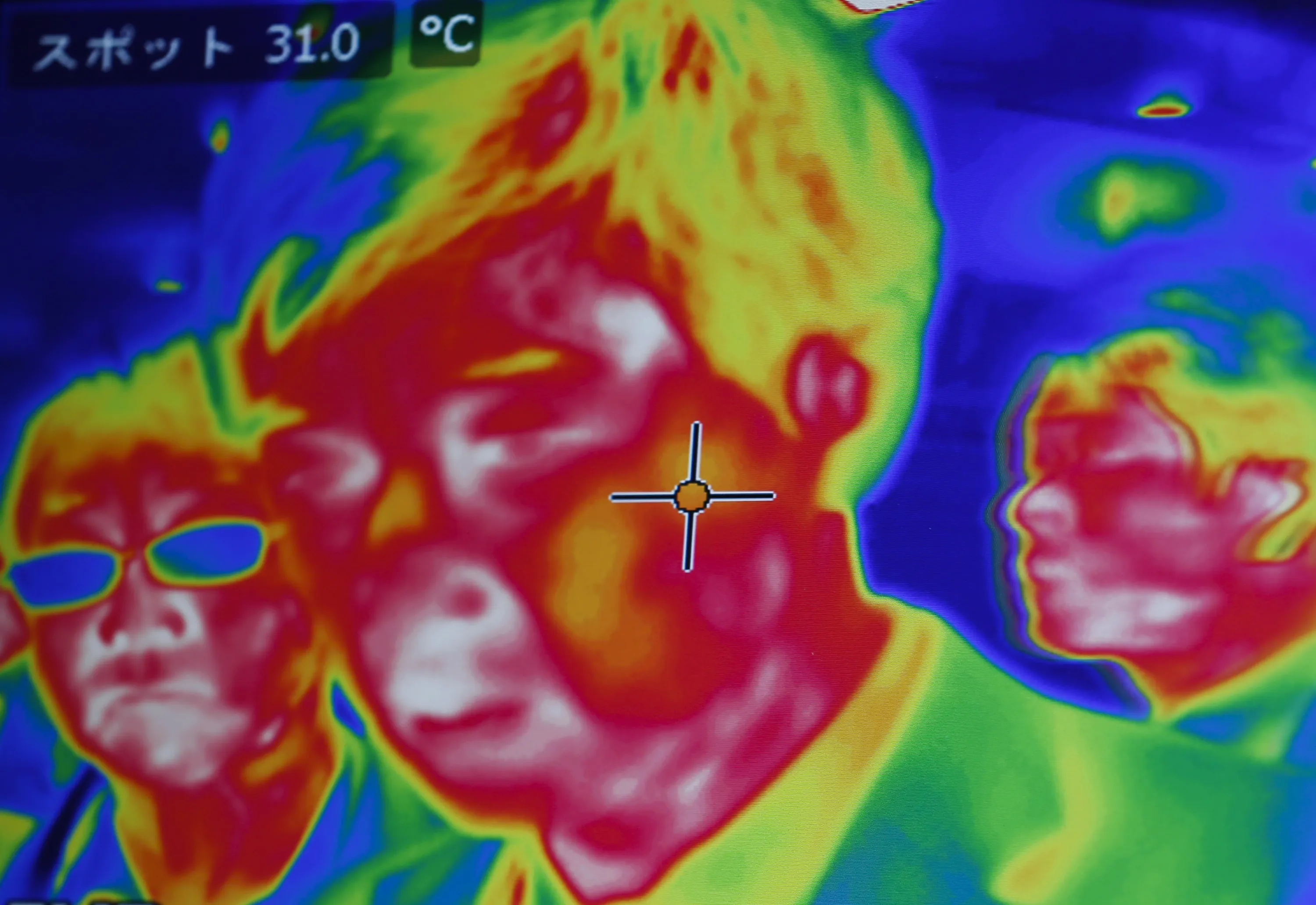 A screen shows visitors filmed with the FLIR GF320 Infrared Camera at the System Control Fair SCF 2015 in Tokyo, Japan December 2, 2015. (Photo by Thomas Peter/Reuters)