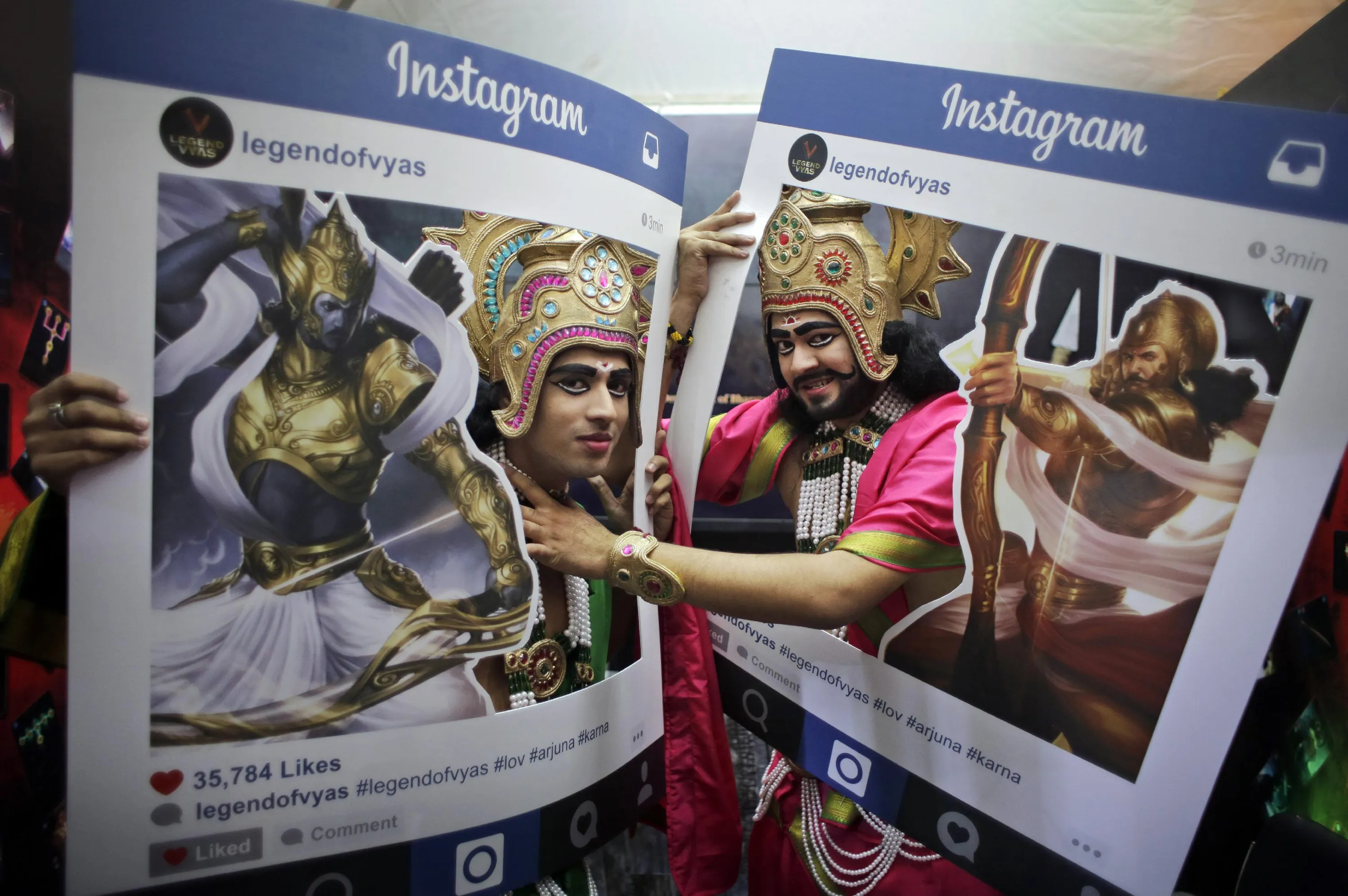 Fans dressed as Hindu mythological characters pose for photographs at Delhi Comic Con in New Delhi, India, Saturday, December 5, 2015. Indian mythological heroes, dressed in gaudy costumes with bejeweled crowns and sparkly clothes, added to the carnival atmosphere of India's annual comic book fest Saturday, ready to oblige fans with an autograph, a selfie or a photograph. (Photo by Altaf Qadri/AP Photo)