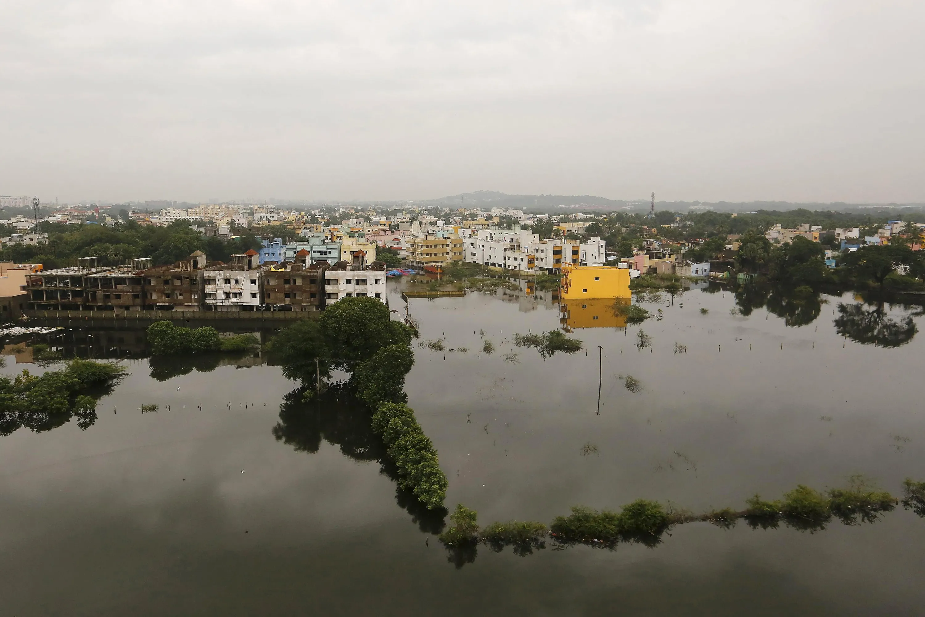 An aerial view shows a flooded residential colony in Chennai, India, December 6, 2015. (Photo by Anindito Mukherjee/Reuters)