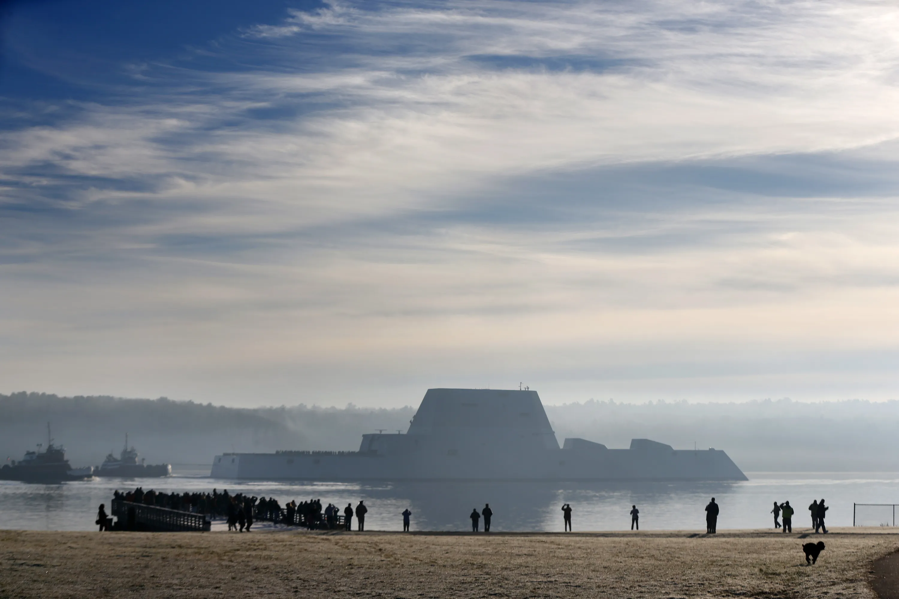 The first Zumwalt-class destroyer, the largest ever built for the U.S. Navy, heads down the Kennebec River after leaving Bath Iron Works, Monday, December 7, 2015, in Bath, Maine. The ship is headed out to sea for the first time to undergo sea trials. (Photo by Robert F. Bukaty/AP Photo)