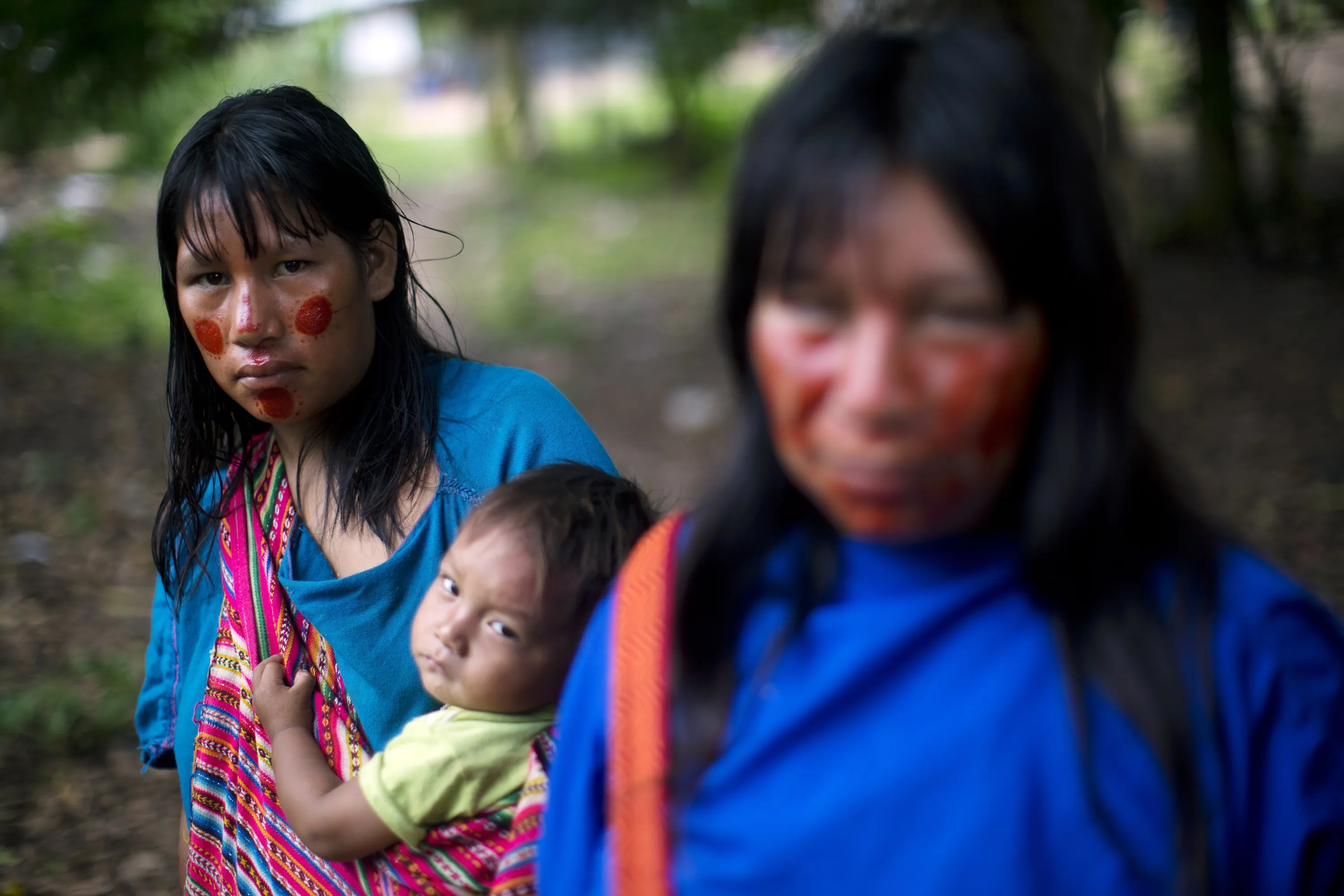 In this November 19, 2015 photo, Lucia Morales looks into the camera, as she stands with her mother and son for a meeting about a government food program for public schools in Pichiquia, in Peru's Junin region. Incursions and assaults by loggers, miners, colonists and leftist guerrillas have reduced the lands of the Ashaninka people in the Peruvian Amazon, leaving many of the 97,000 members of the group malnourished, despite efforts by the government and independent organizations to help. (Photo by Rodrigo Abd/AP Photo)