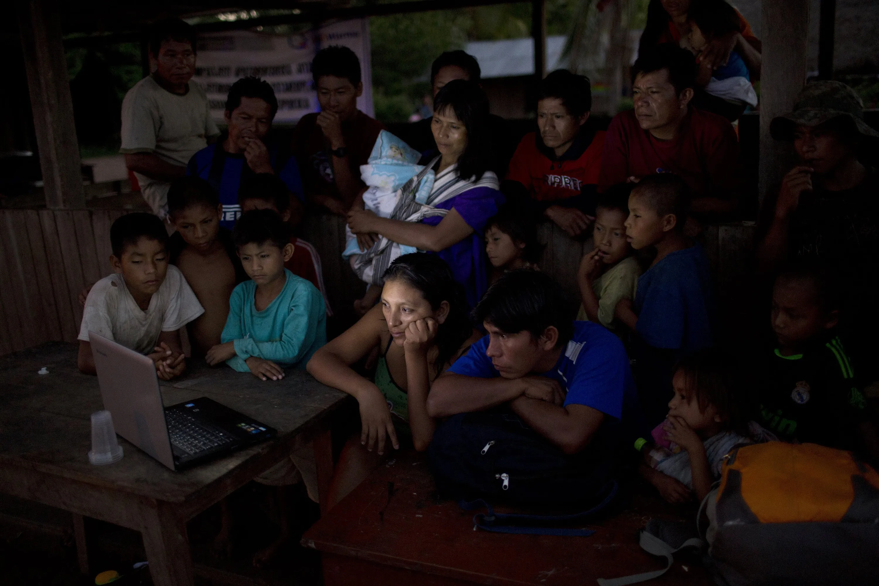In this November 19, 2015 photo, Ashaninkas indigenous watch the horror film series “Wrong Turn” on the laptop of health worker Jessica Ocampo, center, in Pichiquia, in Peru's Junin region. Government officials are visiting the village, which lacks electricity, to encourage good nutrition. (Photo by Rodrigo Abd/AP Photo)