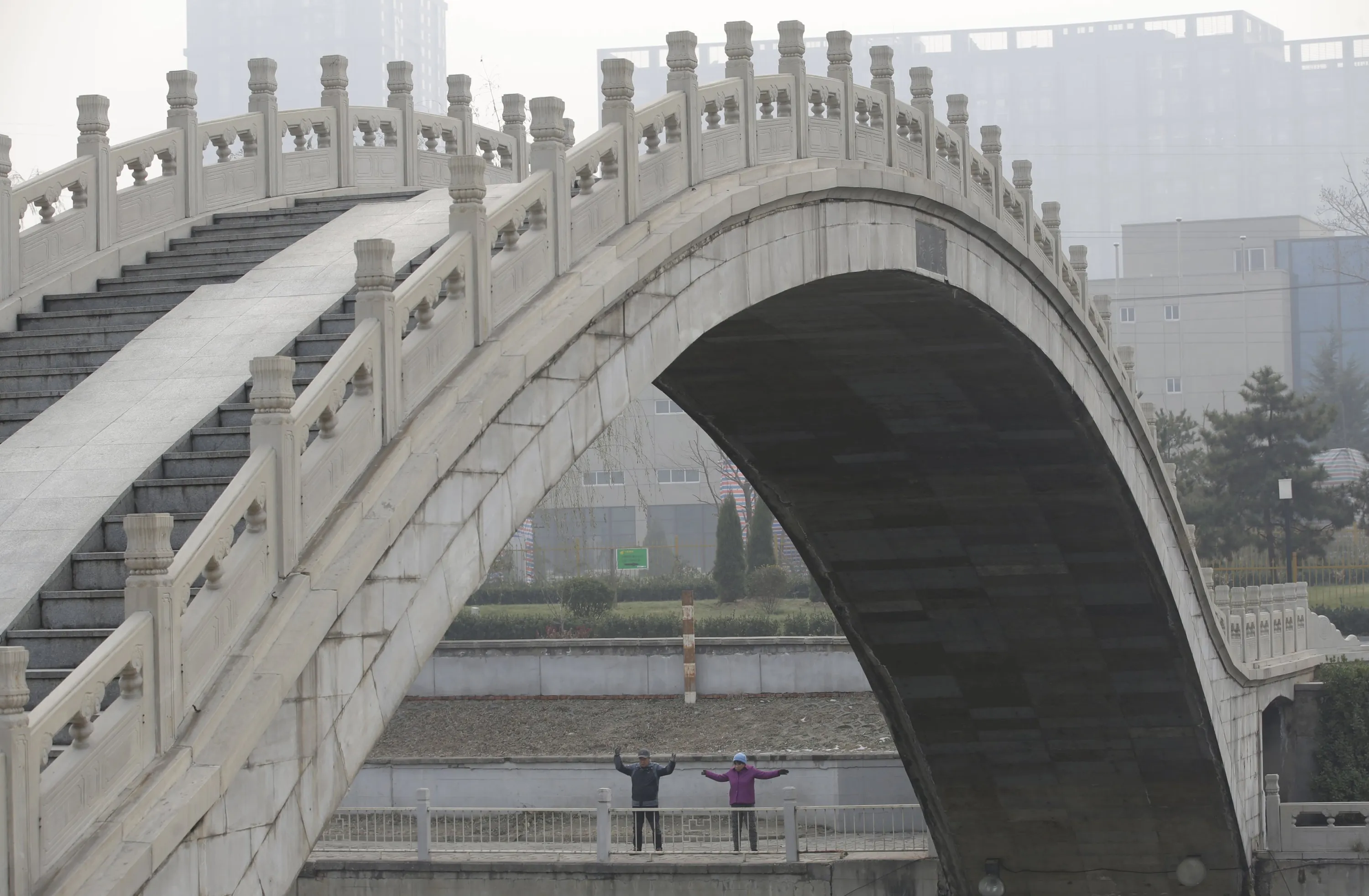 Residents do morning exercise next to a bridge on a hazy day in Beijing, China, December 7, 2015. (Photo by Jason Lee/Reuters)