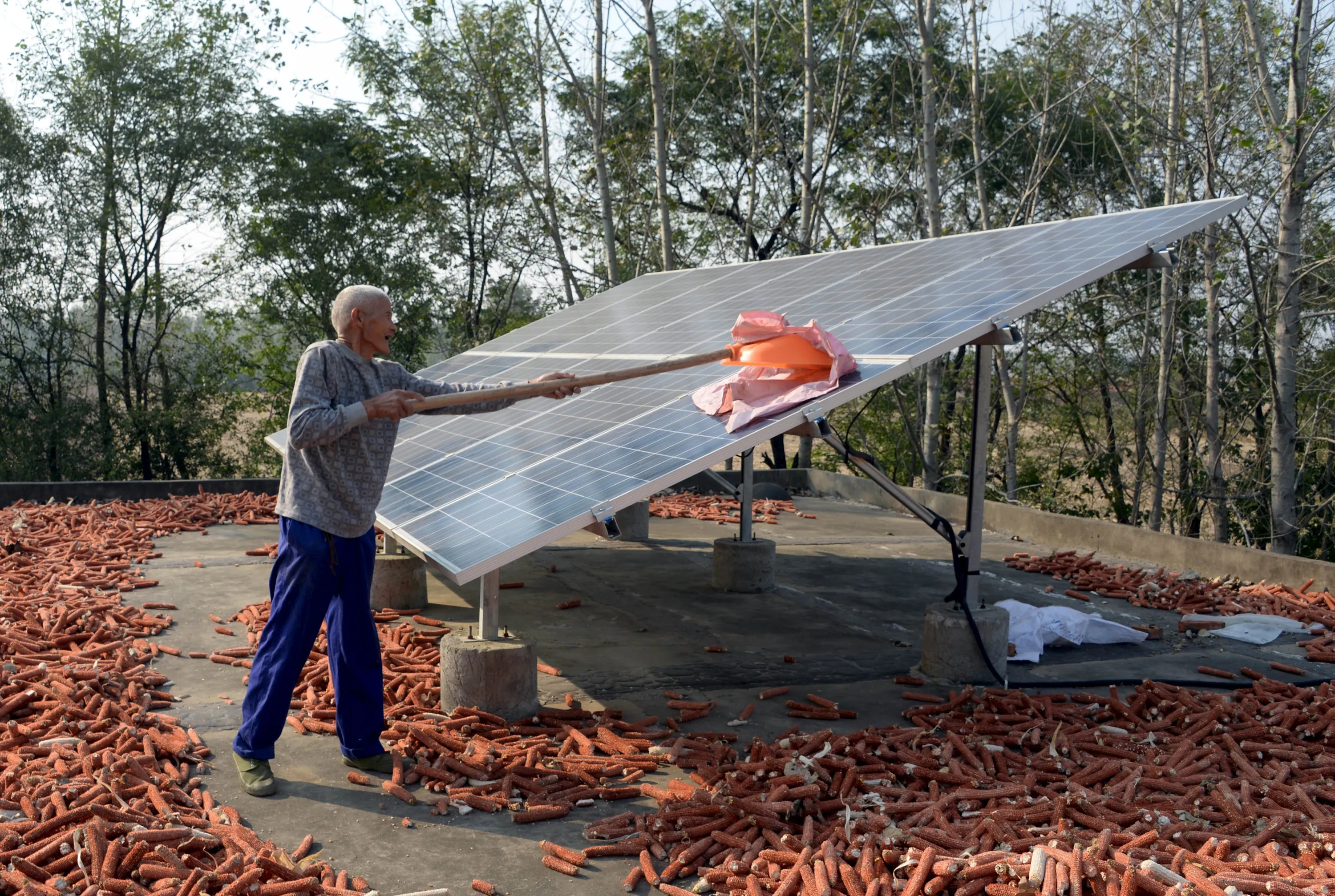 A man cleans a solar panel installed on his rooftop for free by the government, in Bozhou, Anhui province, China, October 12, 2015. (Photo by Reuters/Stringer)