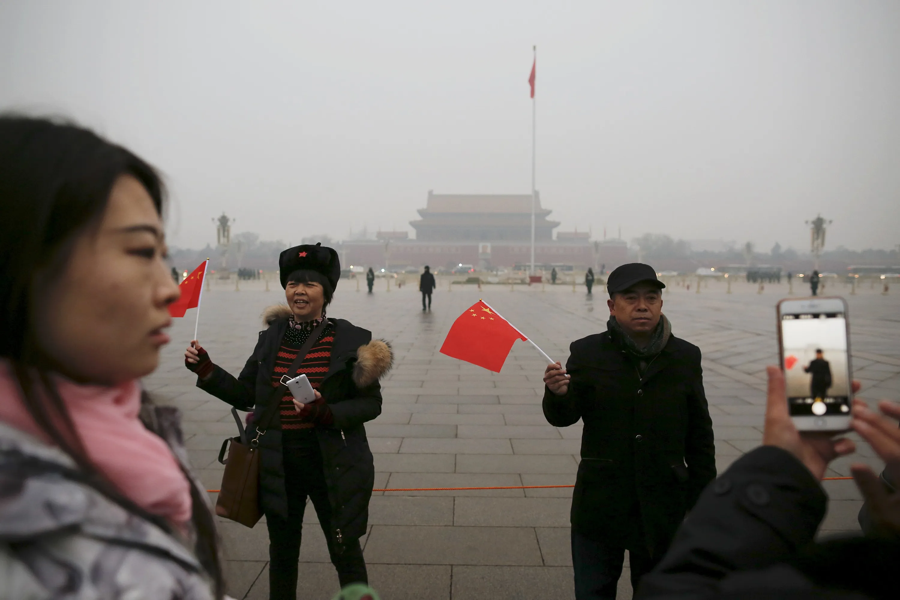 People with national flags have their picture taken just after a flag-raising ceremony amid heavy smog at Tiananmen Square, after the city issued its first ever "red alert" for air pollution, in Beijing December 9, 2015. (Photo by Damir Sagolj/Reuters)