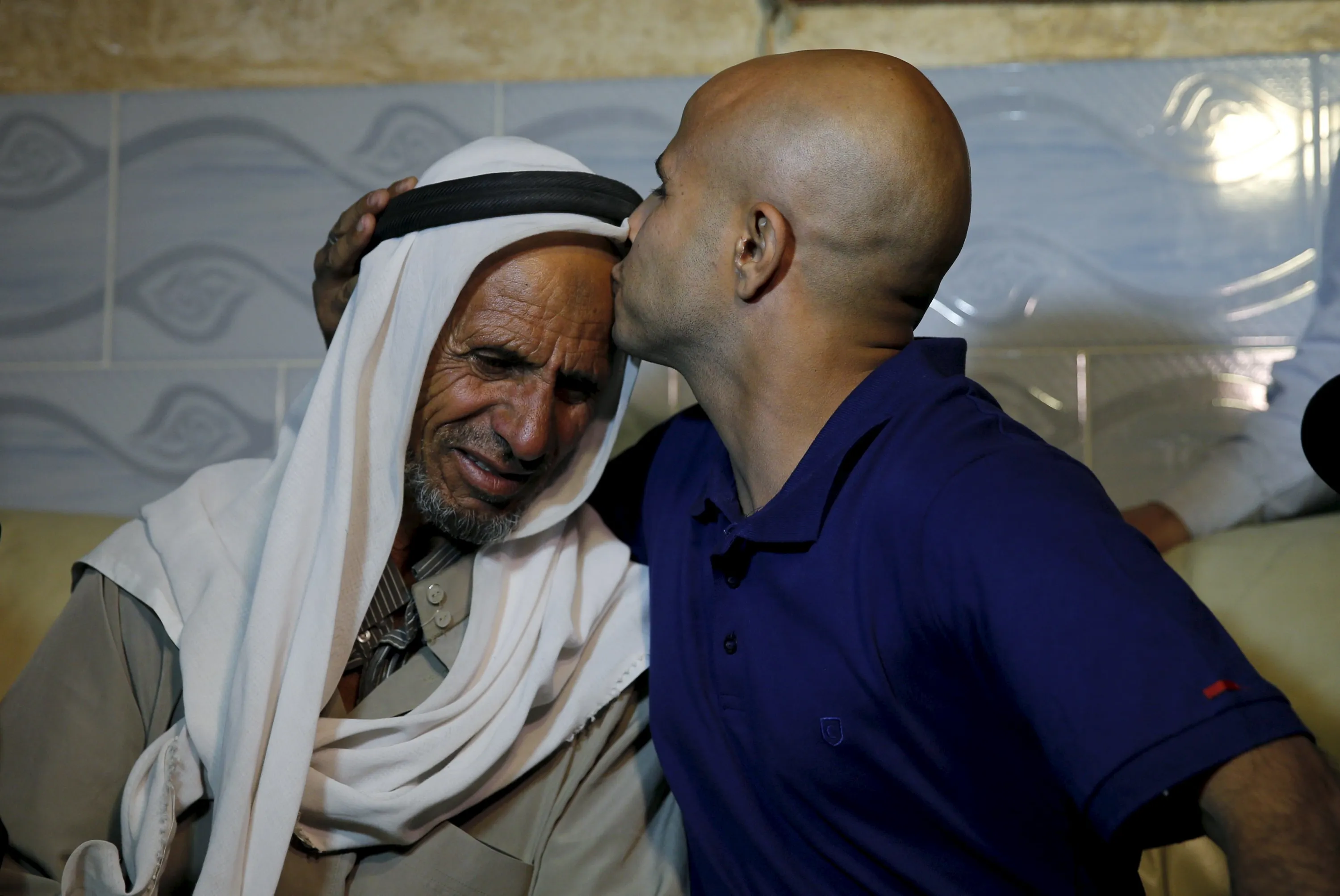 Uda Tarrabin (R) kisses his father Suliman after arriving home following 15 years in Egypt, in the Tarrabin tribe's village near Rahat in southern Israel, December 10, 2015. Egypt has freed Tarrabin, an Israeli-Arab held in its jails for 15 years on espionage charges in exchange for the release of two Egyptians held in Israel, Egyptian and Israeli officials said on Thursday. (Photo by Amir Cohen/Reuters)