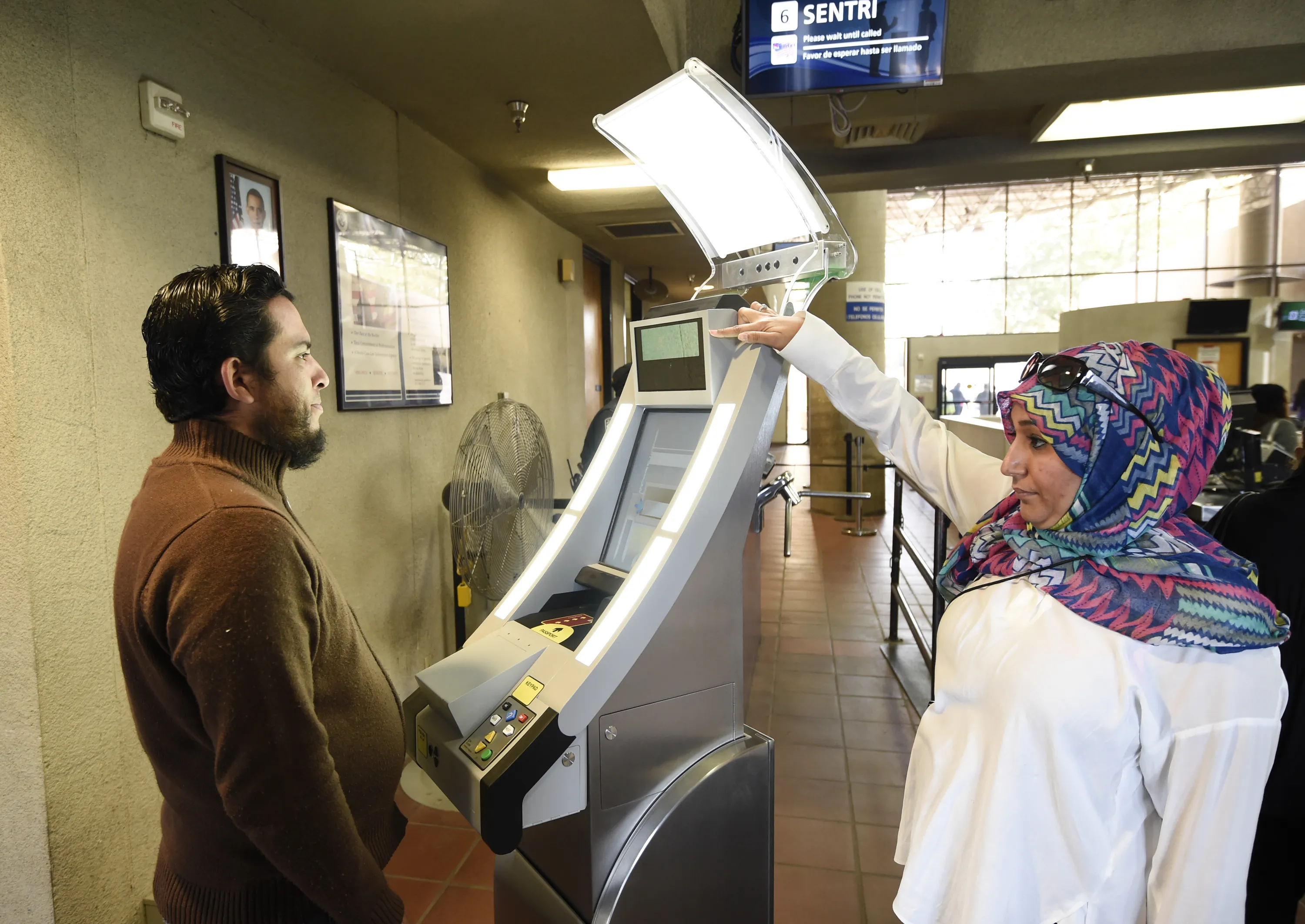 Contractor Sabira Dewji, right, helps a pedestrian crossing from Mexico into the United States at the Otay Mesa Port of Entry have his facial features and eyes scanned at a biometric kiosk Thursday, December 10, 2015, in San Diego. On Thursday, U.S. Customs and Border Protection began capturing facial and eye scans of foreigners entering the country at San Diego's Otay Mesa port of entry on foot. (Photo by Denis Poroy/AP Photo)