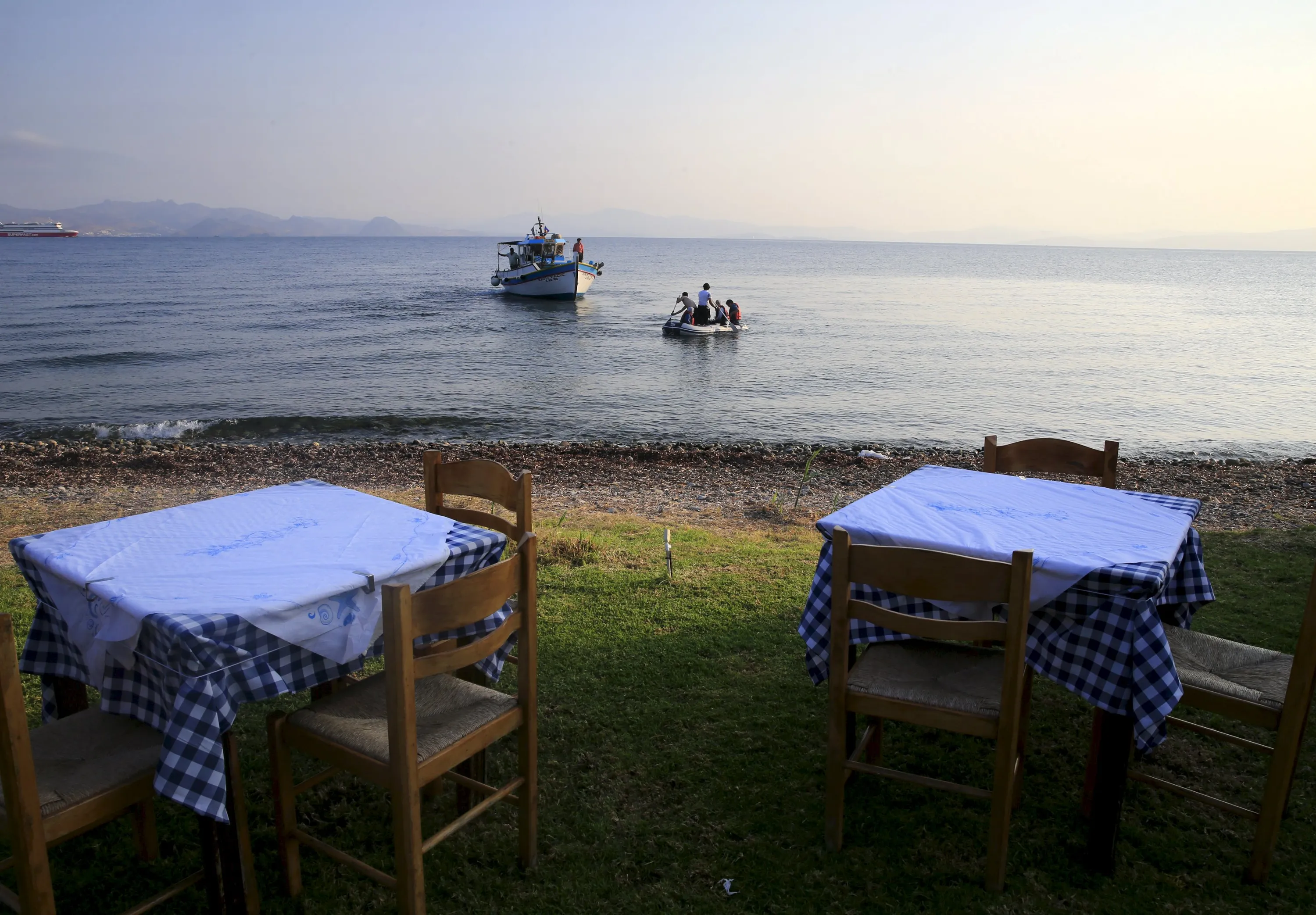 A Syrian refugee family arrives by boat at a beach in front of a tavern on the Greek island of Kos, August 11, 2015. (Photo by Yannis Behrakis/Reuters)