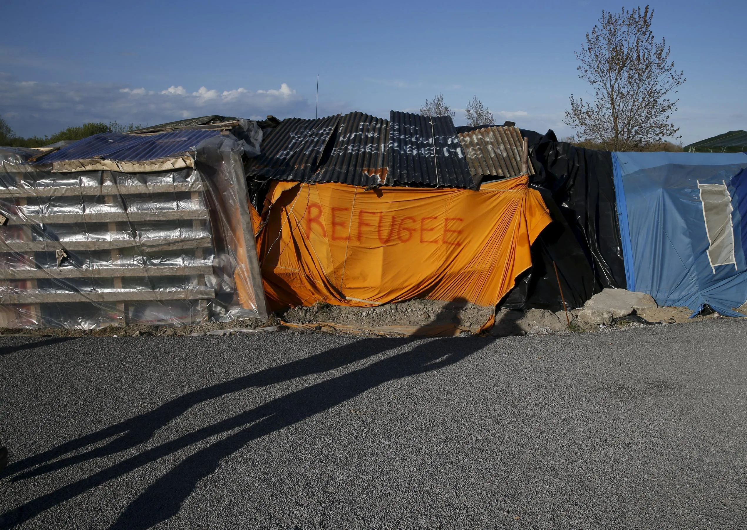 Shadows from migrants are cast on a makeshift shelter with the written word “Refugee” in Calais, France April 30, 2015. (Photo by Pascal Rossignol/Reuters)