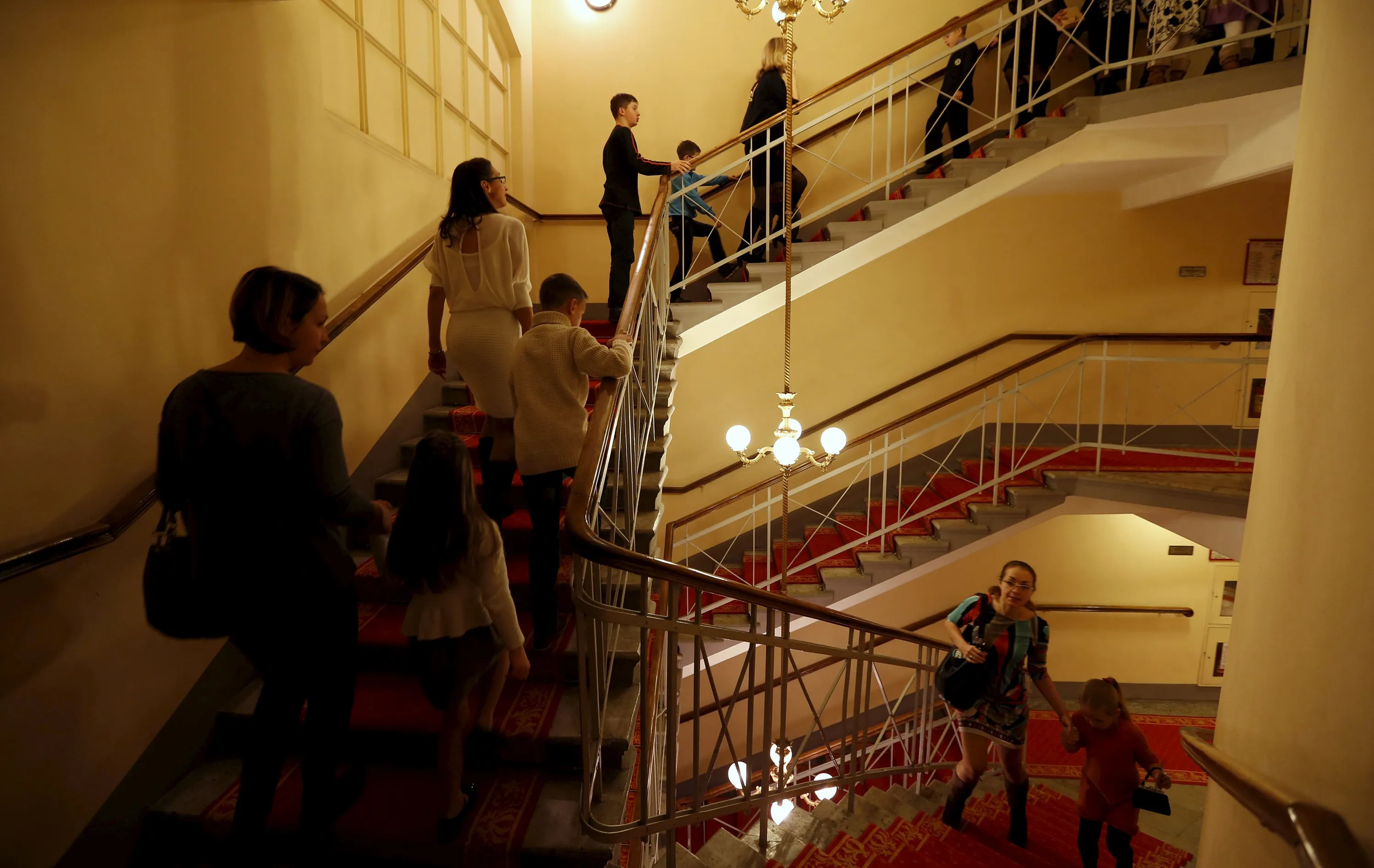 People walk up a staircase during the intermission of Nacho Duato's ballet “The Nutcracker” at the Mikhailovsky Theatre in St. Petersburg, Russia November 21, 2015. (Photo by Grigory Dukor/Reuters)