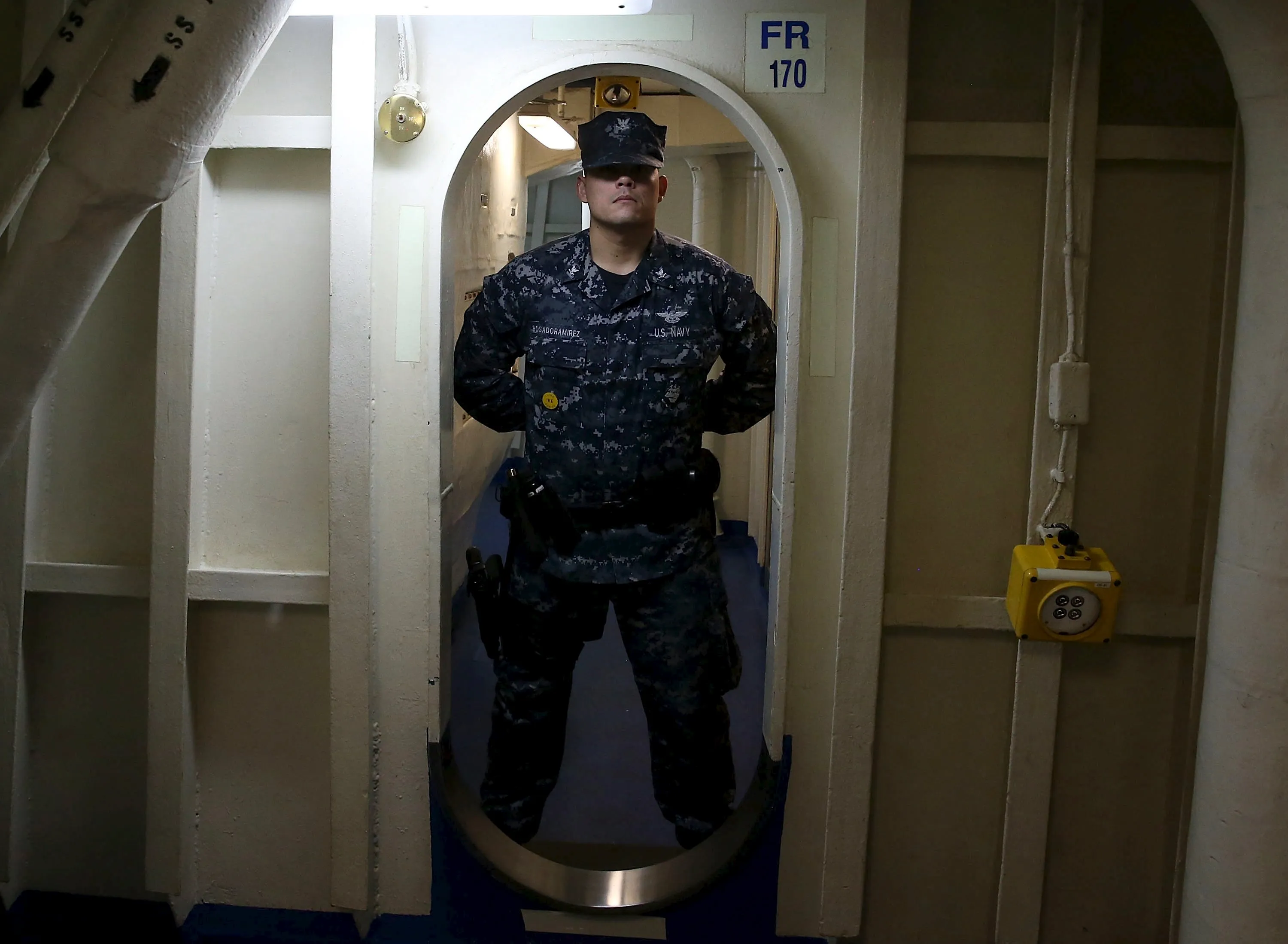 A crew member stands guard in a doorway as U.S. Defense Secretary Ash Carter tours the USS Eisenhower off the coast of Virginia, in the Atlantic Ocean, December 10, 2015. Carter visited the carrier with Indian Defence Minister Manohar Parrikar to demonstrate U.S. Navy aircraft carrier flight operations. (Photo by Mark Wilson/Reuters)