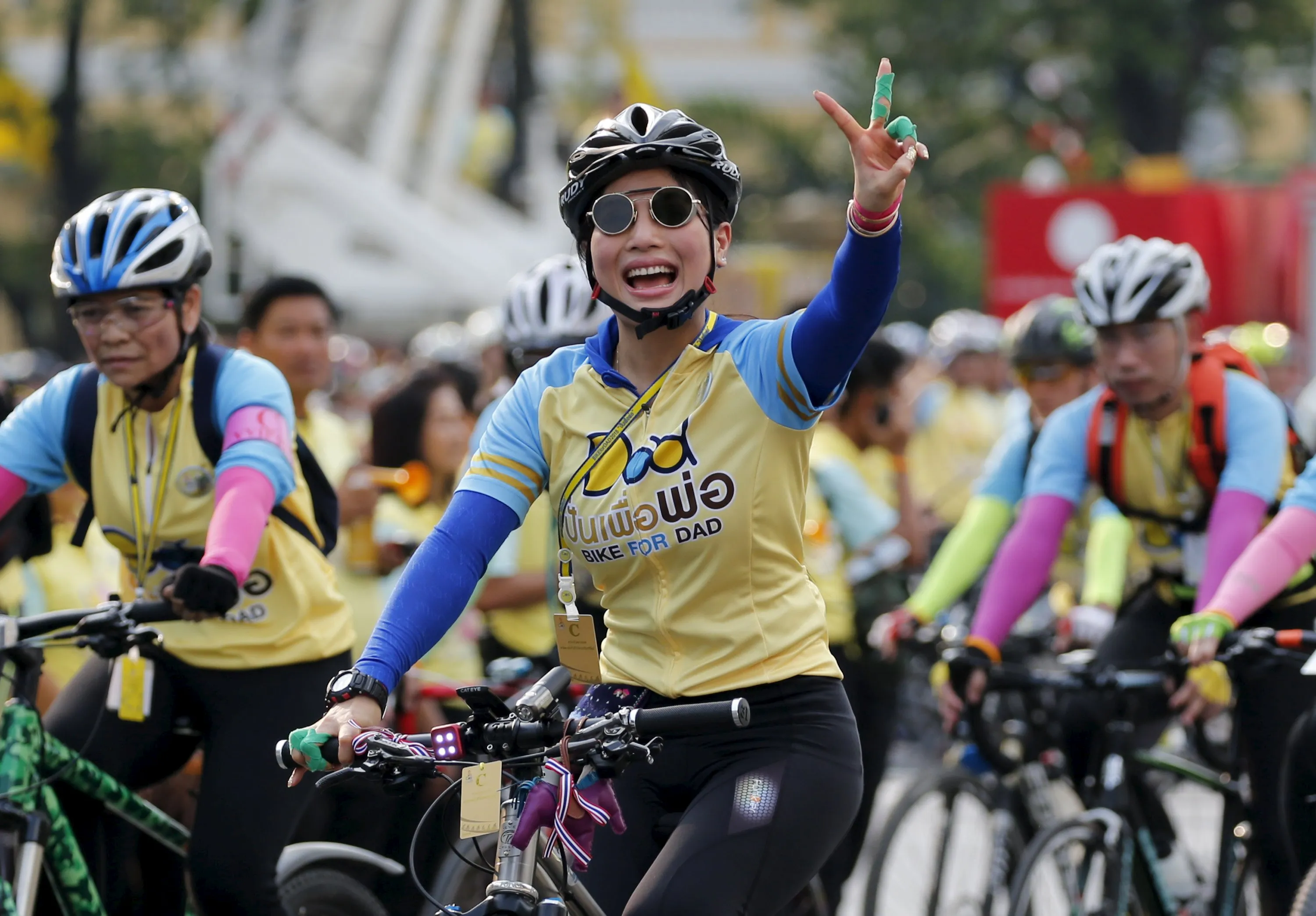 Thailand's Princess Sirivannavari Nariratana waves to crowd as she cycles in the “Bike for Dad” event in Bangkok, Thailand, December 11, 2015. Thai Crown Prince Maha Vajiralongkorn led thousand of cyclists on a 29-km course in Bangkok to celebrate King Bhumibol Adulyadej's 88th birthday which fell on December 5. (Photo by Chaiwat Subprasom/Reuters)
