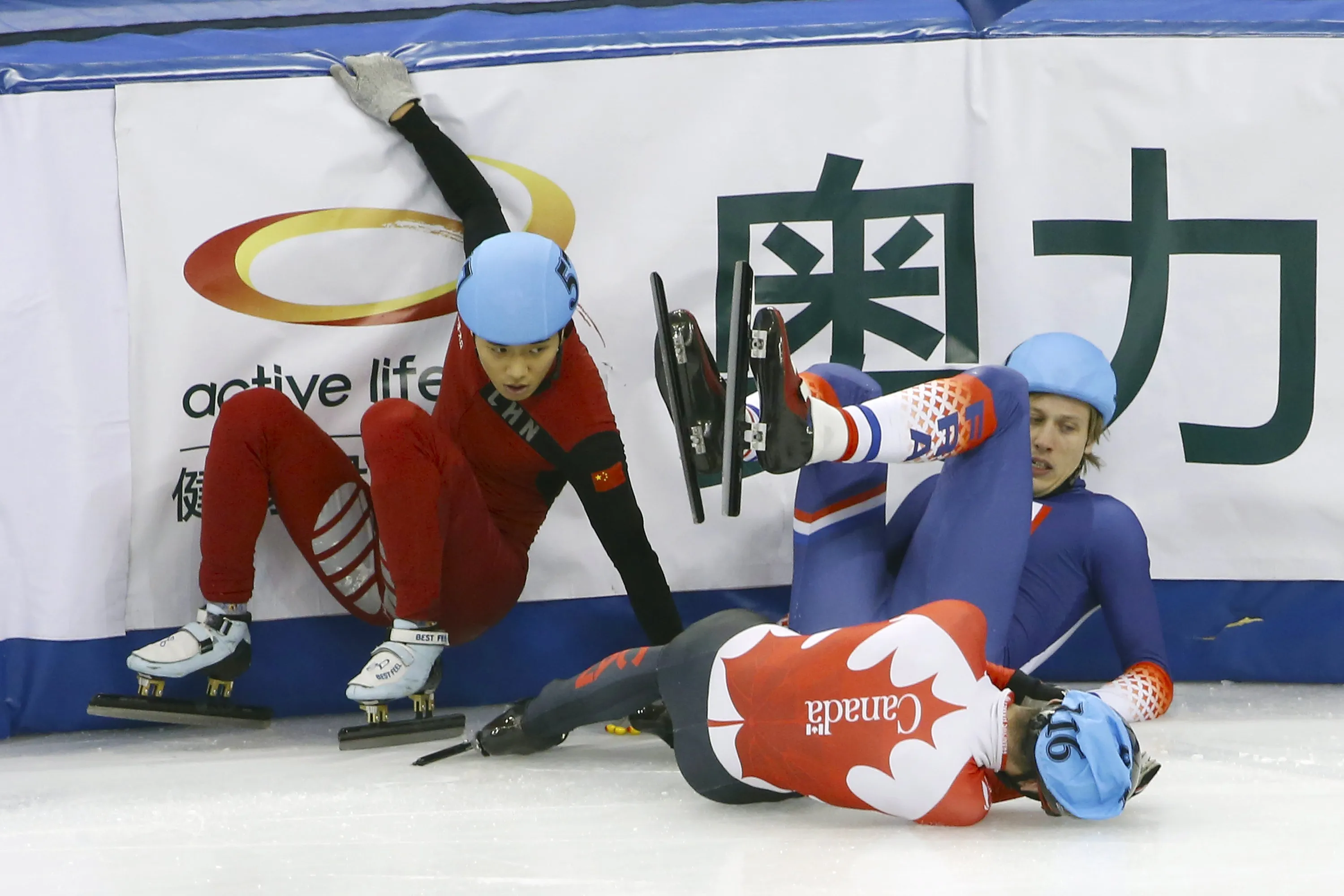 Chen Guang (L) of China, Sebastien Lepape of France and Francois Hamelin (front) of Canada crash into the barrier while competing in the men's 1500m final during the ISU World Cup Short Track Speed Skating competition in Shanghai, China, December 12, 2015. (Photo by Aly Song/Reuters)