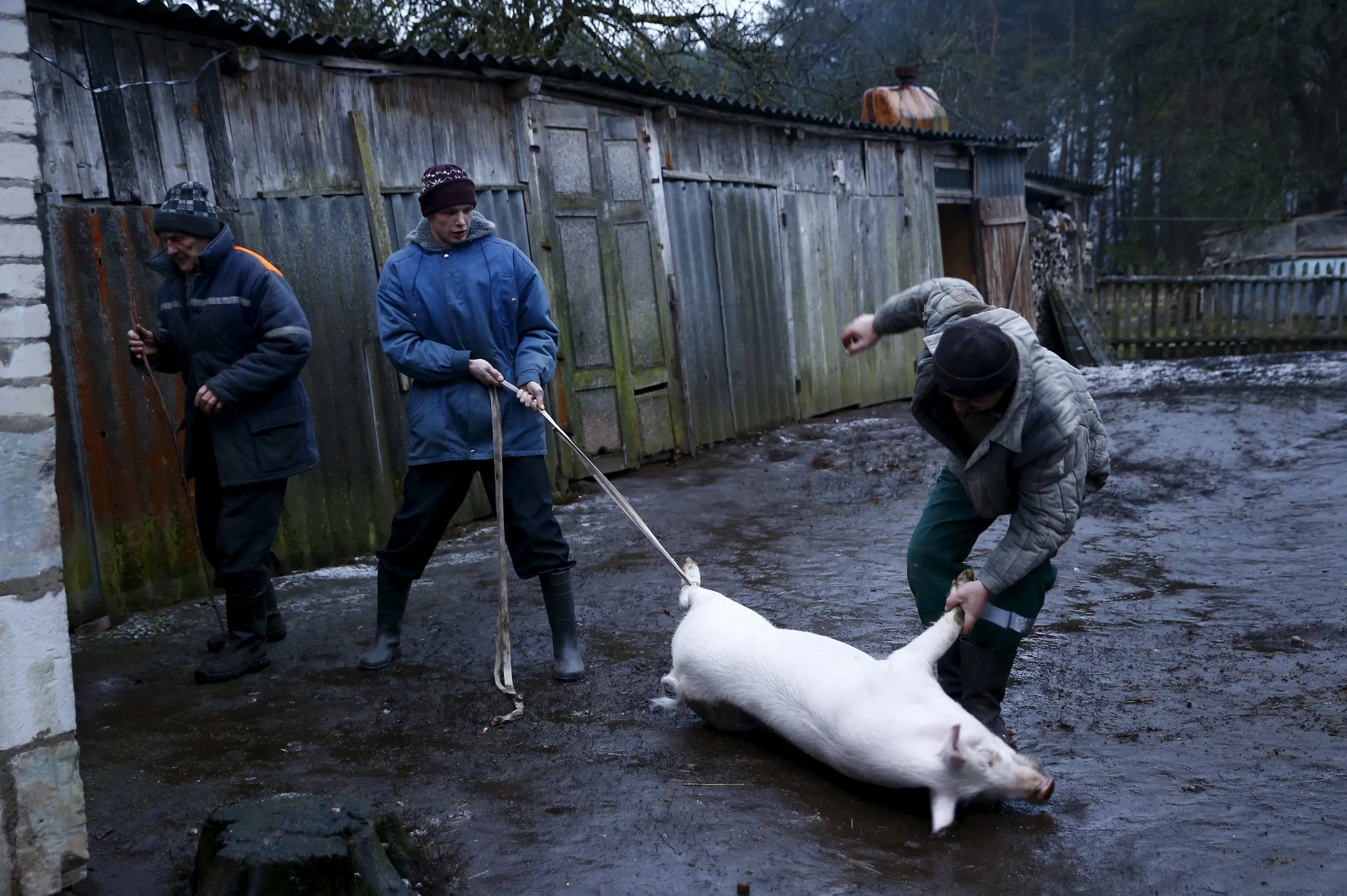 Belarussian men drag a pig from into a barn for slaughtering it in the village of Azerany, Belarus, December 12, 2015. (Photo by Vasily Fedosenko/Reuters)