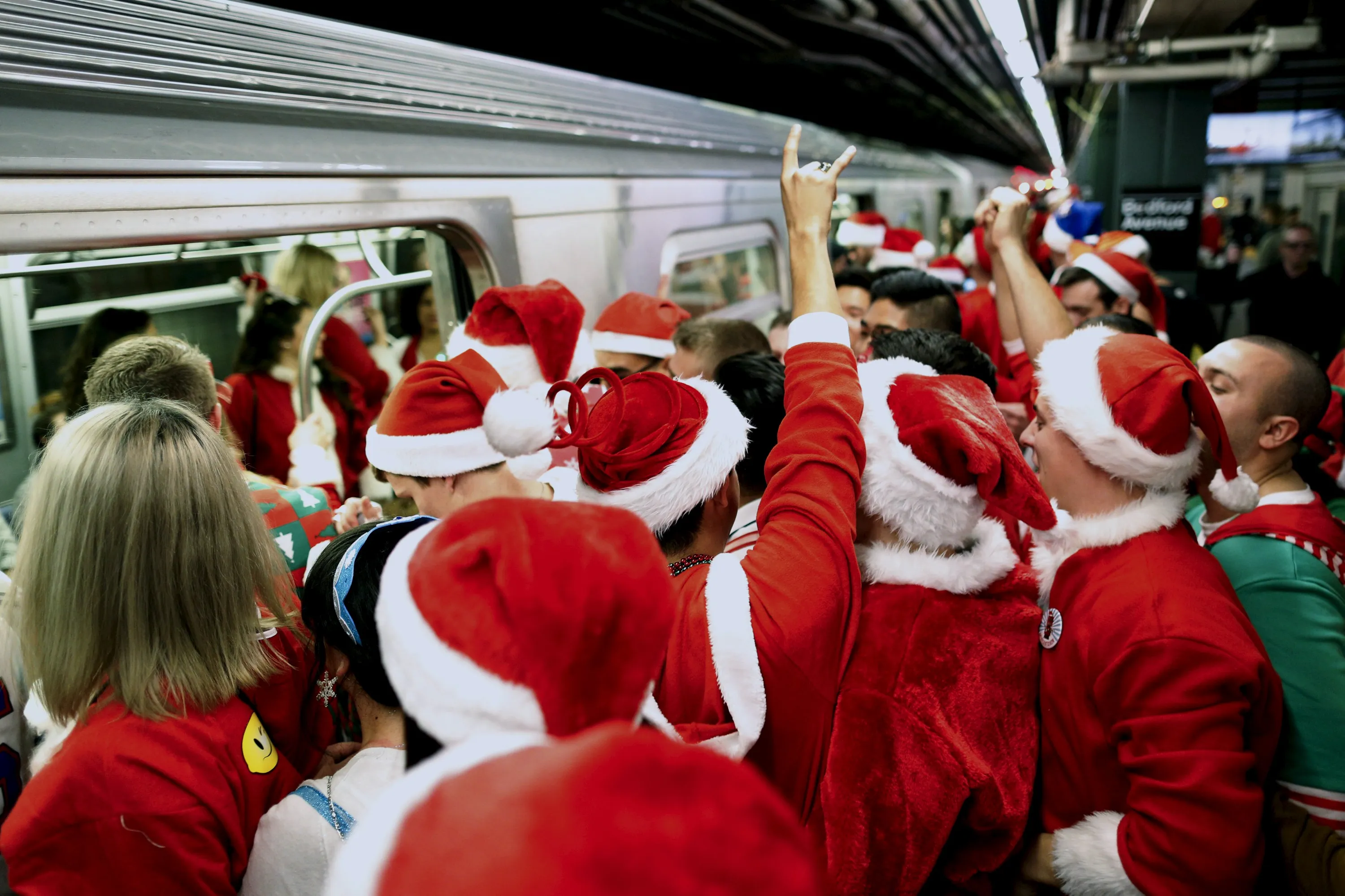 Revelers dressed in Santa Claus and other holiday themed outfits wait for the subway during the annual SantaCon event in the Brooklyn borough of New York, December 12, 2015. (Photo by Brendan McDermid/Reuters)