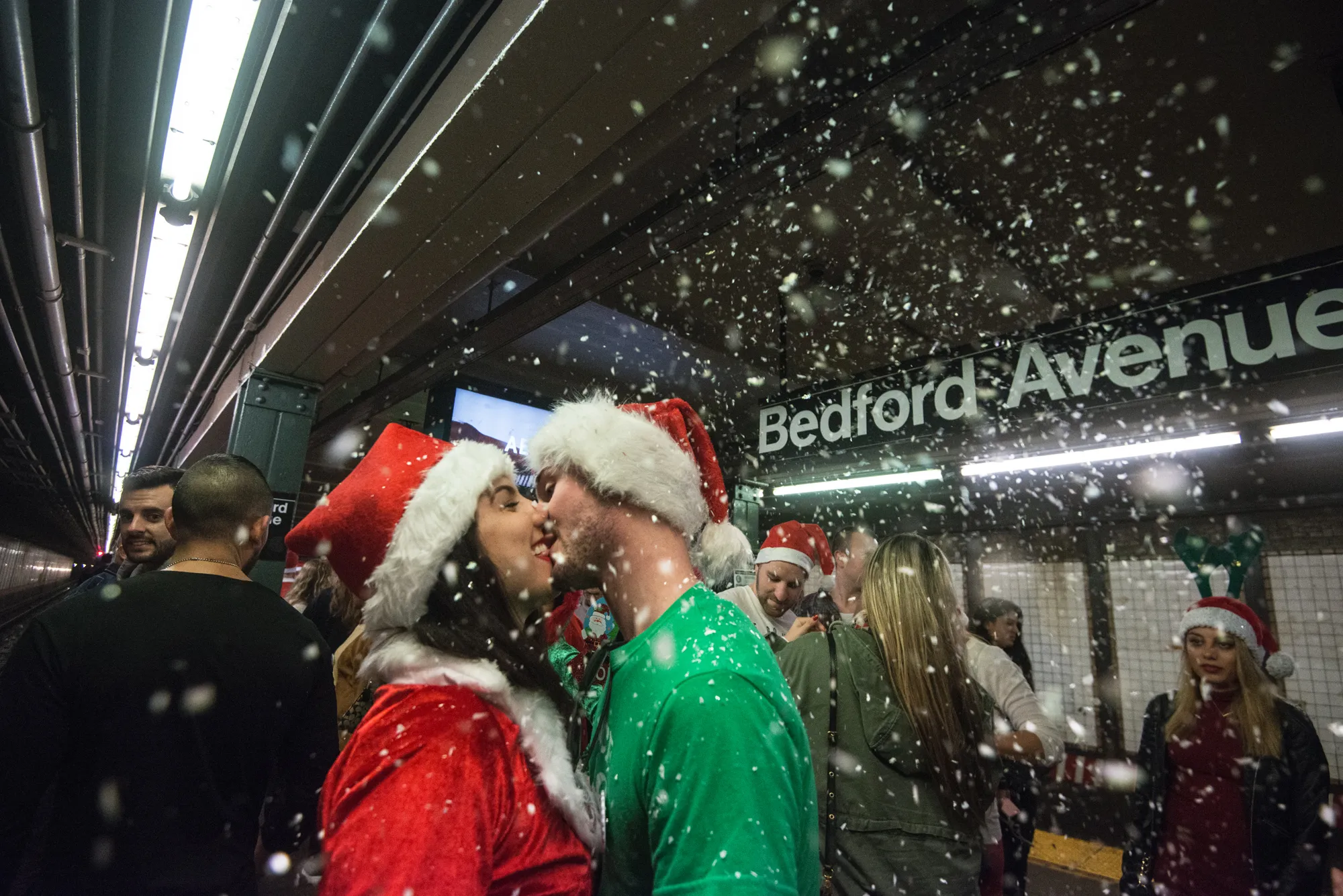 Two people dressed as a Santa share a kiss on the subway platform during the annual SantaCon pub crawl December 12, 2015 in the Brooklyn borough of New York City. (Photo by Stephanie Keith/Getty Images)