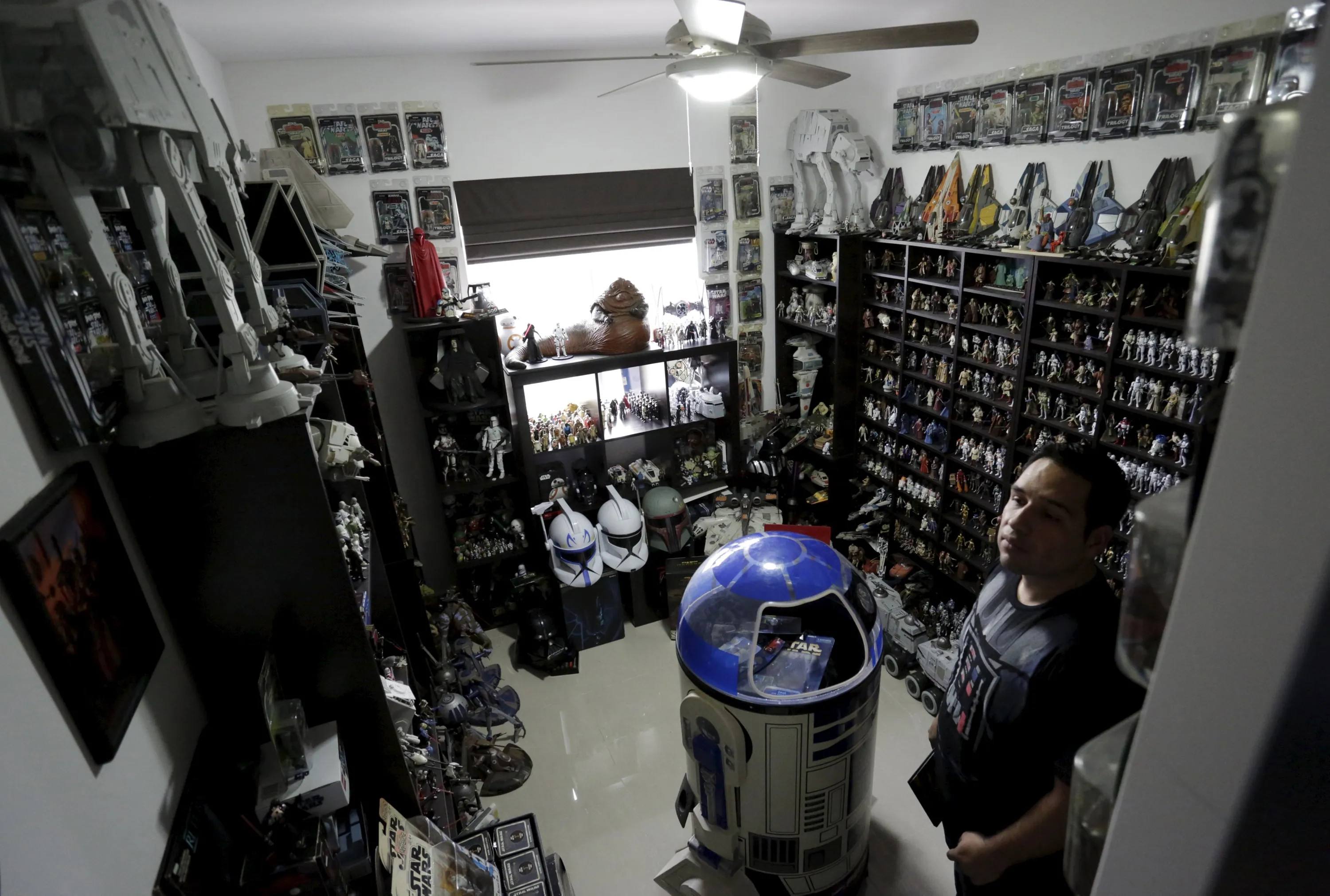 Mexican collector Pablo Perez, is seen next to a toy collection of Star Wars characters and items at his home in Monterrey, Mexico December 12, 2015. (Photo by Daniel Becerril/Reuters)