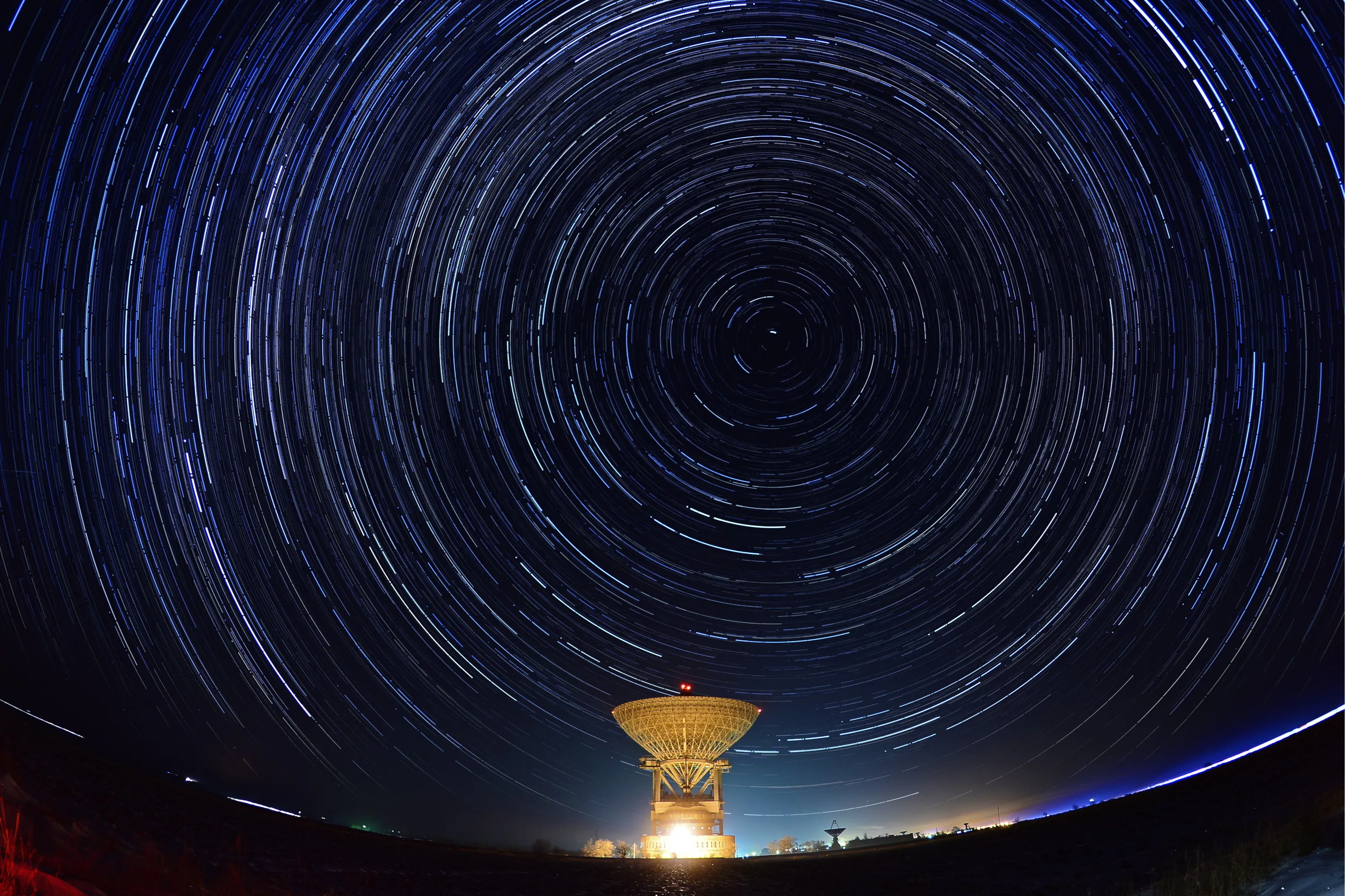 Meteors streak across the night sky over the Galenki RT-70 radio telescope at a Kvant-D command and measurement complex which is part of the Titov Main Space Test Centre in Primorye Territory, Russia on December 14, 2015. (Photo by Smityuk Yuri/TASS via ZUMA Press)