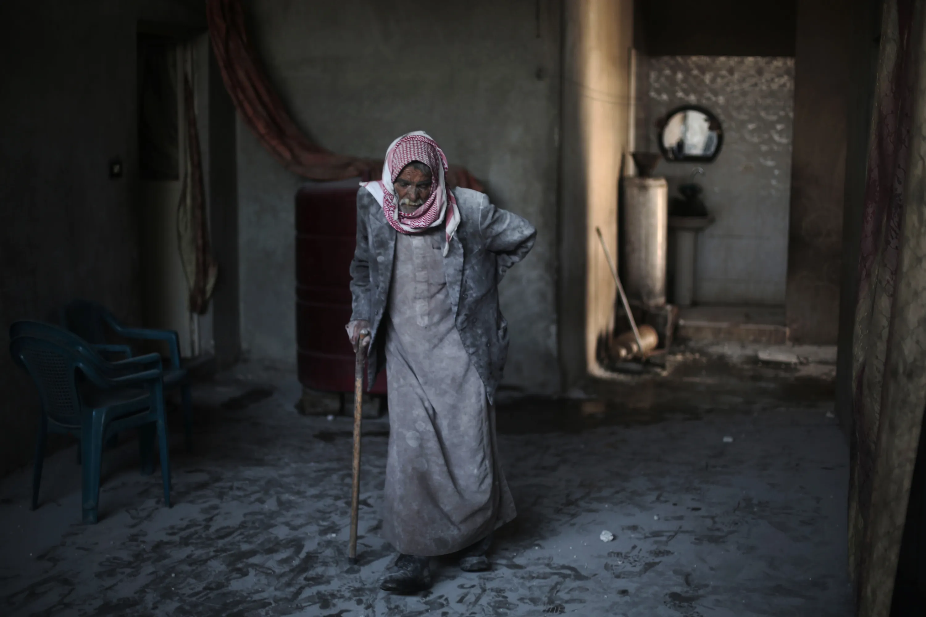 Syrian Abu Mohammed, covered with dust from explosions, walks in his home following reported air strikes by regime forces on the town of al-Nashabiyah in the eastern Ghouta region, a rebel stronghold east of the capital Damascus, on December 14, 2015. United Nations aid chief Stephen O�Brien said that the “indiscriminate attacks” against civilians in Damascus and the surrounding region were “unacceptable” at the end of a visit to Syria. (Photo by Amer Almohibany/AFP Photo)