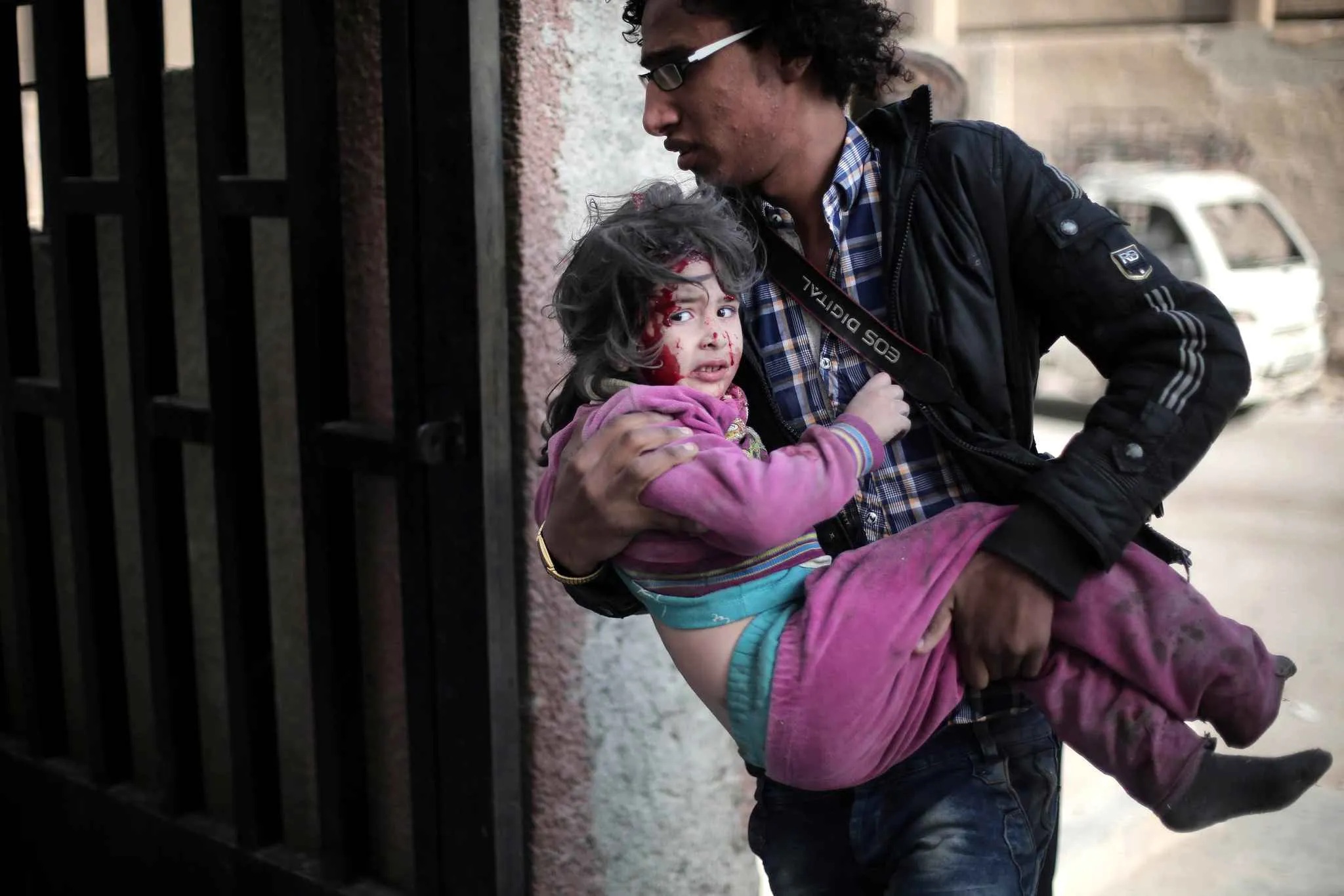 A Syrian photographer carries an injured girl following reported air strikes by regime forces on the town of al-Nashabiyah in the eastern Ghouta region, a rebel stronghold east of the capital Damascus, on December 14, 2015. (Photo by Amer Almohibany/AFP Photo)