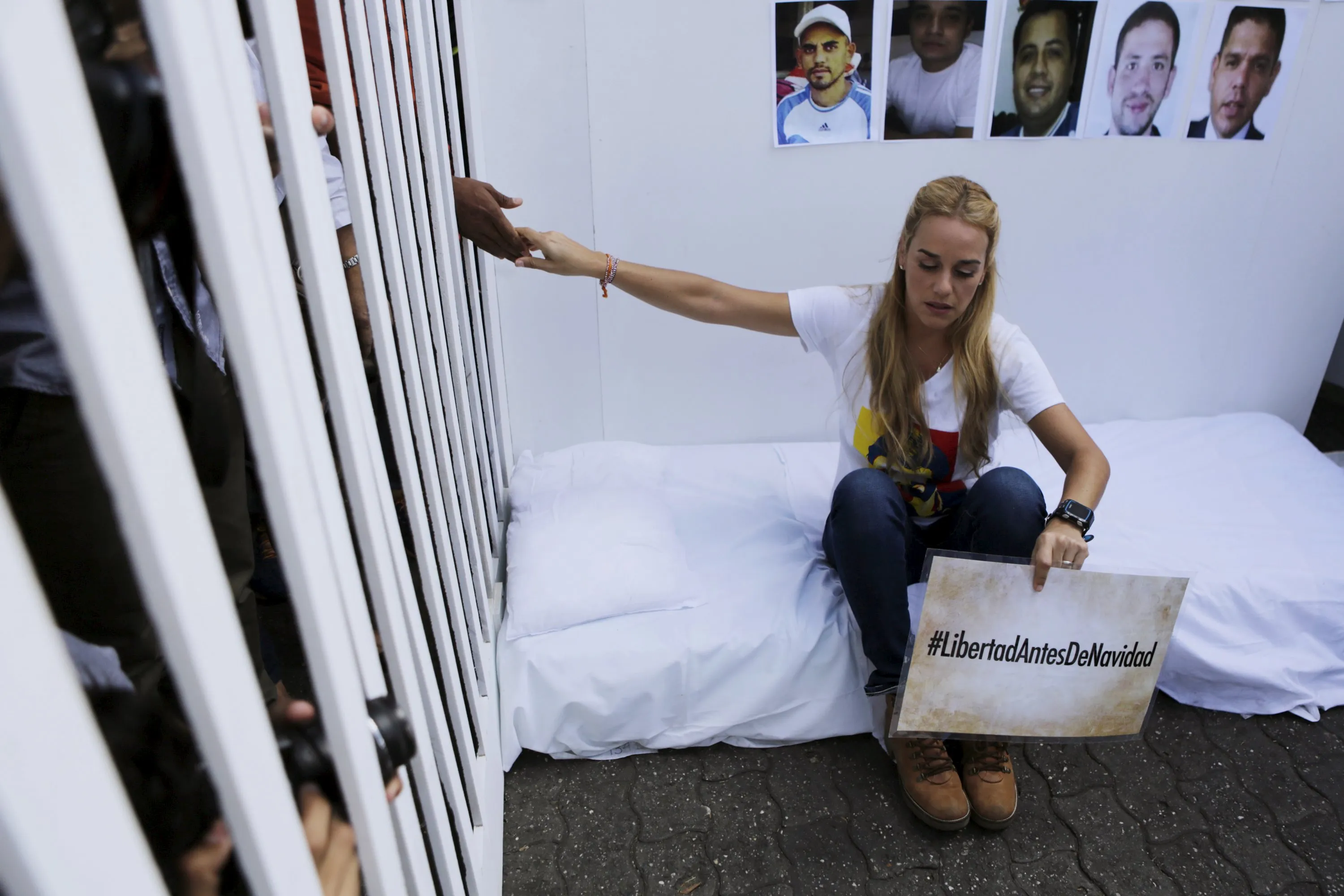 Lilian Tintori, wife of jailed Venezuelan opposition leader Leopoldo Lopez, holds the hand of a person through the bars of a mock prison cell underneath photographs of jailed opposition supporters, during a news conference in Caracas, December 14, 2015. The sign reads “Liberty before Christmas”. (Photo by Marco Bello/Reuters)