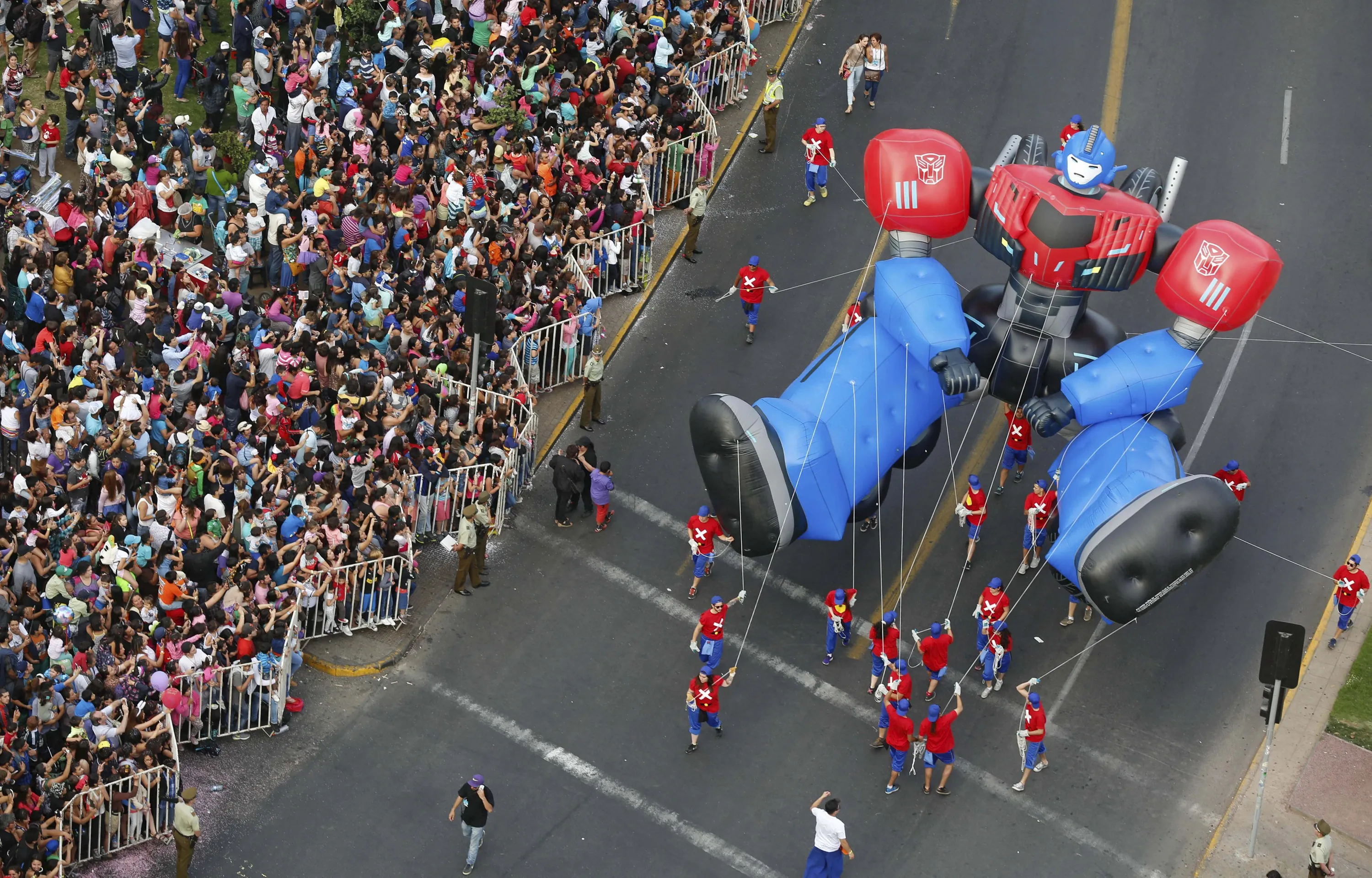 The Optimus Prime balloon makes its way along the streets during an annual Christmas parade at Santiago town in Chile, December 13, 2015. (Photo by Pablo Sanhueza/Reuters)
