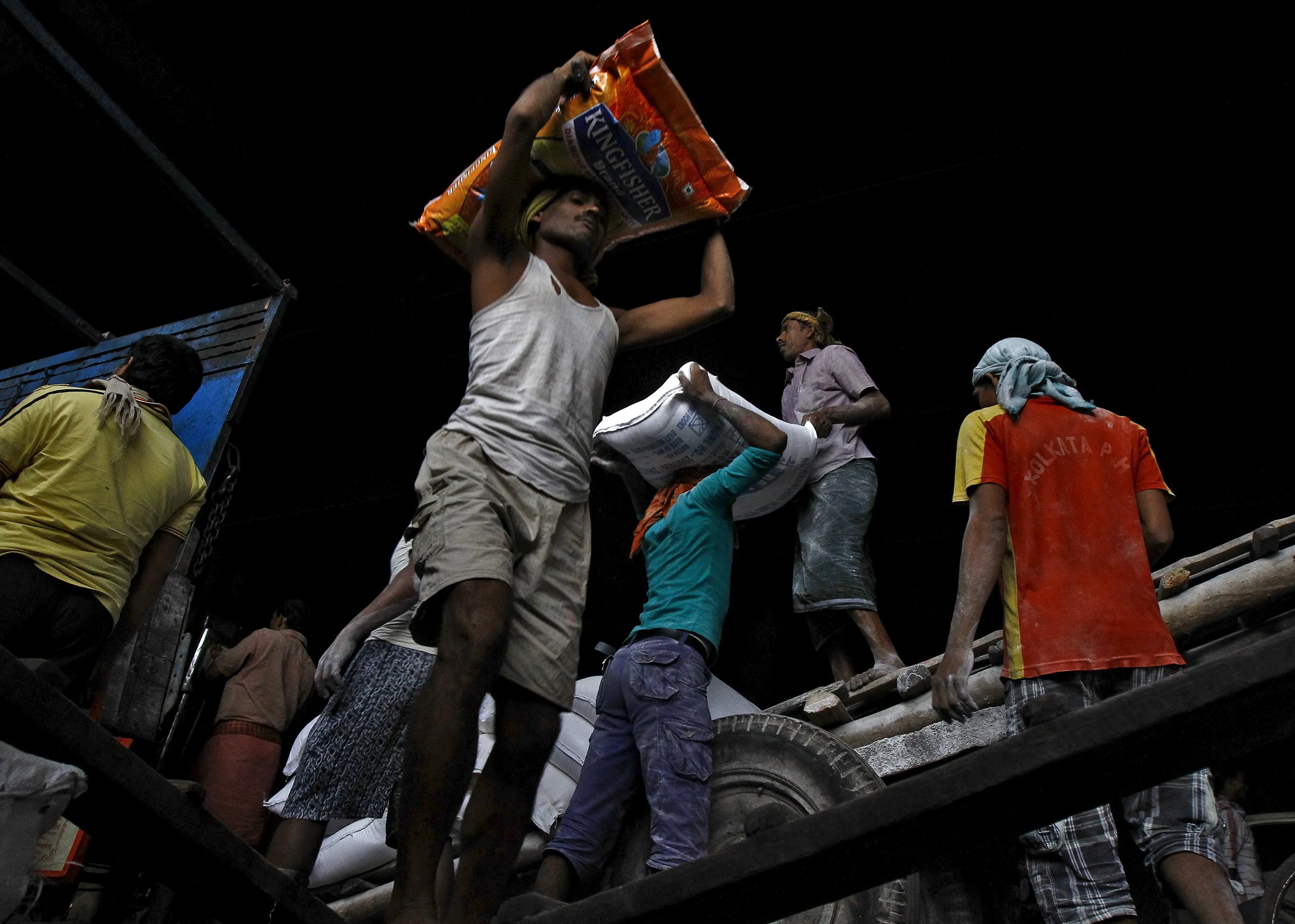 Labourers load sacks of flour and rice onto a supply truck at a wholesale market in Kolkata, India, December 14, 2015. India's wholesale prices fell for a 13th straight month in November, but a sharp pickup in food prices and a pending wage hike for millions of government employees are likely to keep policymakers worried about potential inflationary risks. (Photo by Rupak De Chowdhuri/Reuters)