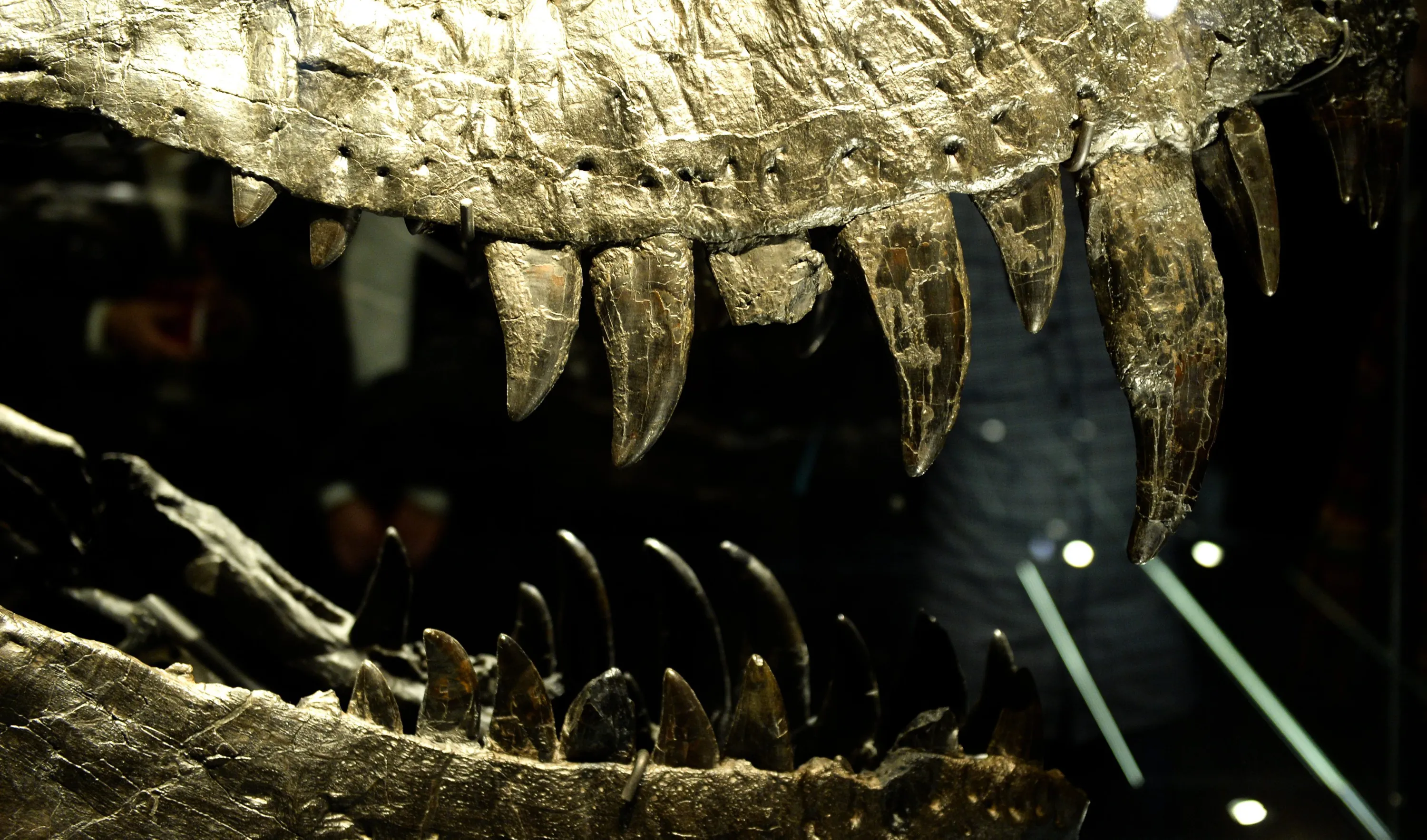 A close-up view of the skeleton of Tyrannosaurus Rex named “Tristan Otto” displayed at the Natural History Museum in Berlin, Germany, 16 December 2015. At around four meters high and twelve meters in length, it dominates the new exhibition about T. rex, which will be open to visitors from 17 December at the Berlin Museum of Natural History. (Photo by Britta Pedersen/EPA)