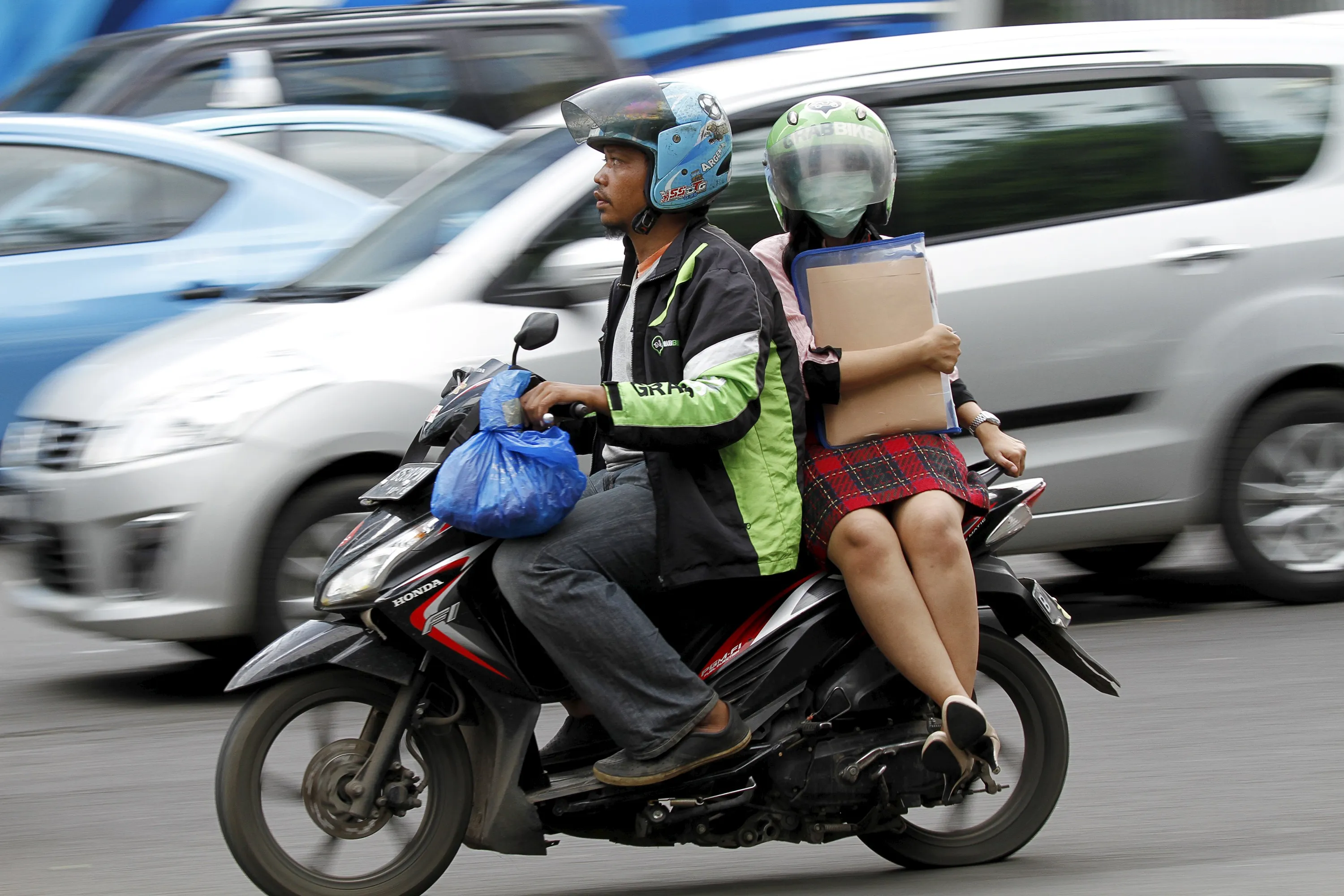 A woman rides on the back of a motorbike, part of the GrabBike ride-hailing service, on a busy street in central Jakarta, Indonesia December 18, 2015. Indonesia's president publicly rebuked one of his cabinet ministers on Friday for a clampdown on ride-hailing services such as Uber and Go-Jek, which triggered outrage on social media in a country where public transport options are limited. (Photo by Garry Lotulung/Reuters)