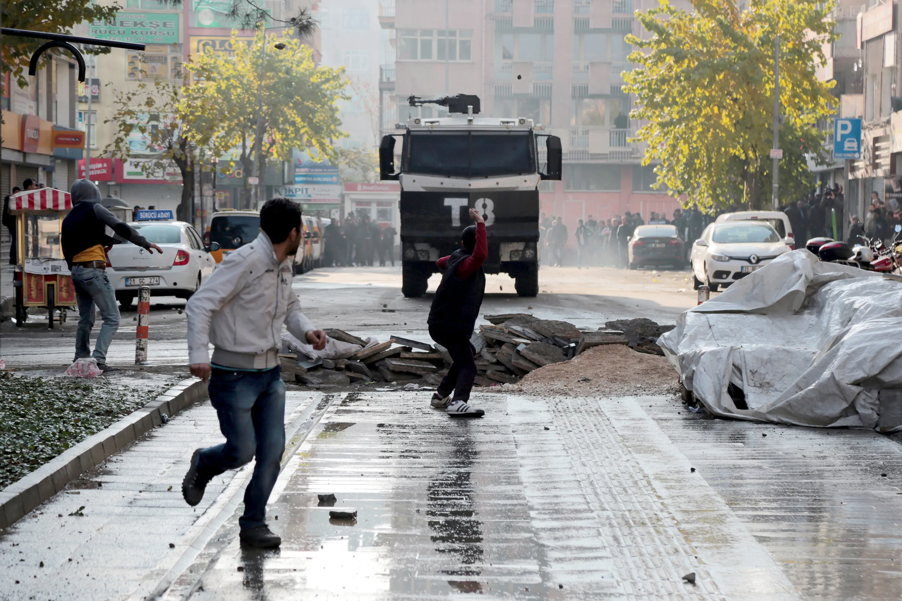 A demonstrator throws stones at a police vehicle during a protest against the curfew in Sur district, in the southeastern city of Diyarbakir, Turkey, December 18, 2015. (Photo by Sertac Kayar/Reuters)