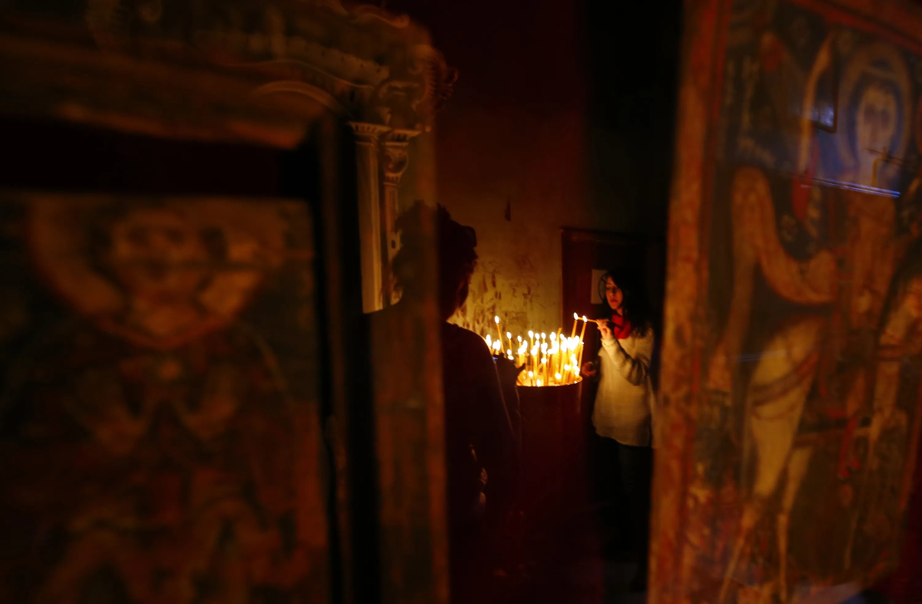 A woman lights a candle around an old Christian drawing inside a church at Saint Catherine's monastery, in the Sinai Peninsula, south of Egypt, December 8, 2015. (Photo by Amr Abdallah Dalsh/Reuters)