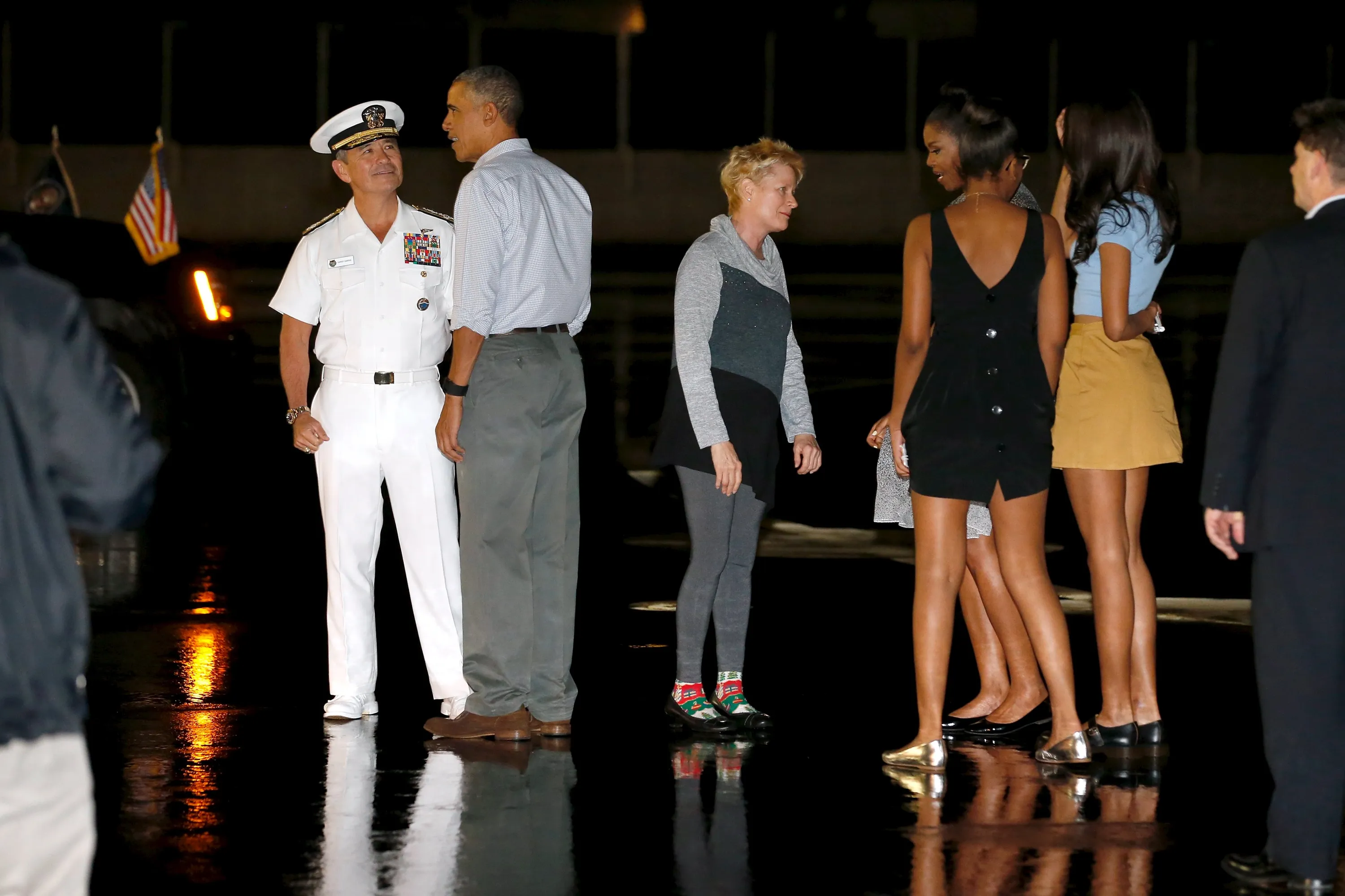 U.S. President Barack Obama (2nd L) and his family are greeted by U.S. Navy Admiral Harry Harris (L) and his wife Bruni Bradley (3rd L) as the Obamas arrive via Air Force One at Joint Base Pearl Harbor-Hickam in Honolulu, Hawaii December 19, 2015. (Photo by Jonathan Ernst/Reuters)