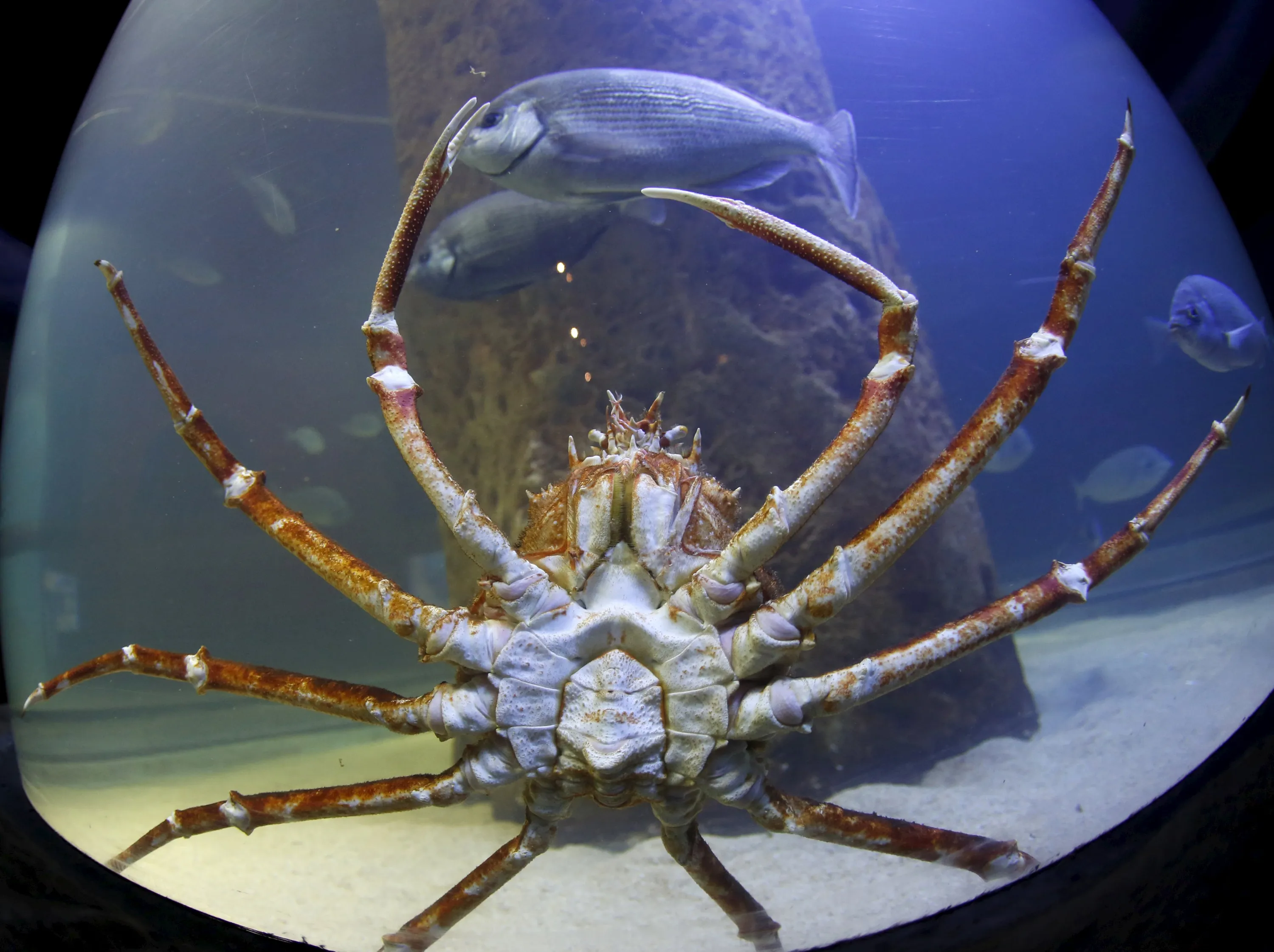 A giant Japanese spider crab crawls along the side of its tank at the Malta National Aquarium in Qawra, outside Valletta, Malta, December 19, 2015. (Photo by Darrin Zammit Lupi/Reuters)
