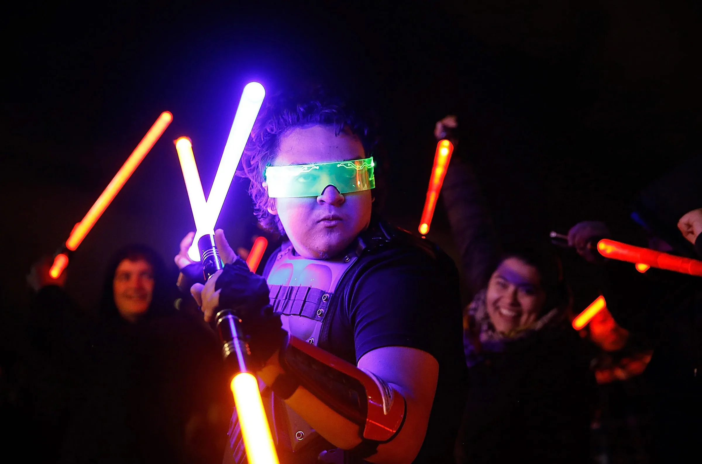 Fans participate in the Star Wars Lightsaber Battle “The Light Battle Tour” at Washington Square Park on December 18, 2015 in New York City. (Photo by John Lamparski/Getty Images)