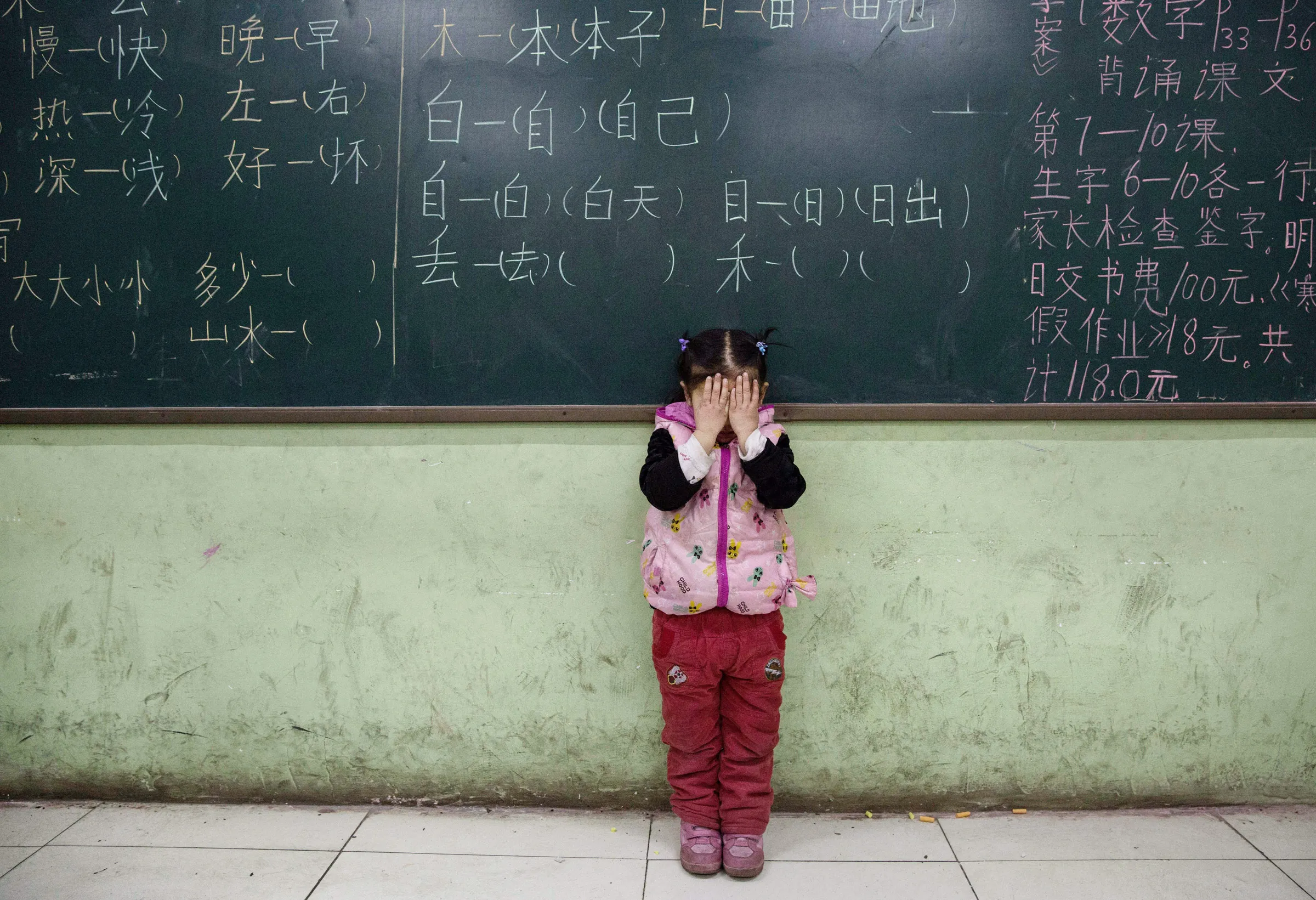 A Chinese student who is a child of migrants does eye exercises as part of a class at an un-official school on December 18, 2015 in Beijing, China. Schools for children of migrants are often unofficial or unrecognized by the state, and were established as a response to the education void created by the decades-long household registration or hukou system. A person's hukou entitles them to social services in their birthplace, meaning millions of Chinese who have migrated from rural areas to cities have been denied rights to urban public services. Reforms to the hukou system come after heavy criticism that it has aggravated a deep social divide in China. The changes could pave the way for up to 70 million children of migrant workers left behind in villages to join their parents in cities. (Photo by Kevin Frayer/Getty Images)