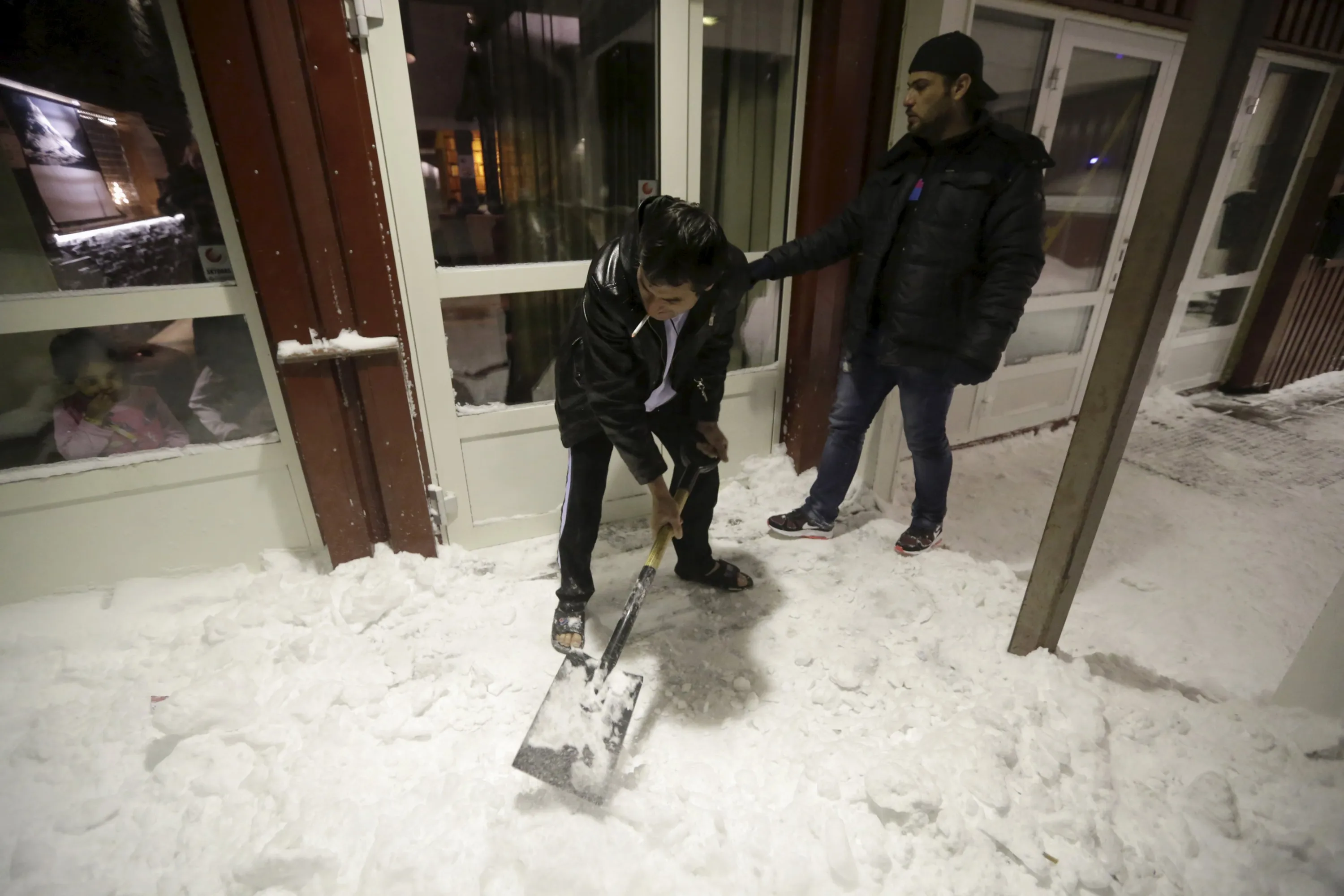 A refugee clears snow at the entrance of a camp at a hotel touted as the world's most northerly ski resort in Riksgransen, Sweden, December 15, 2015. (Photo by Ints Kalnins/Reuters)