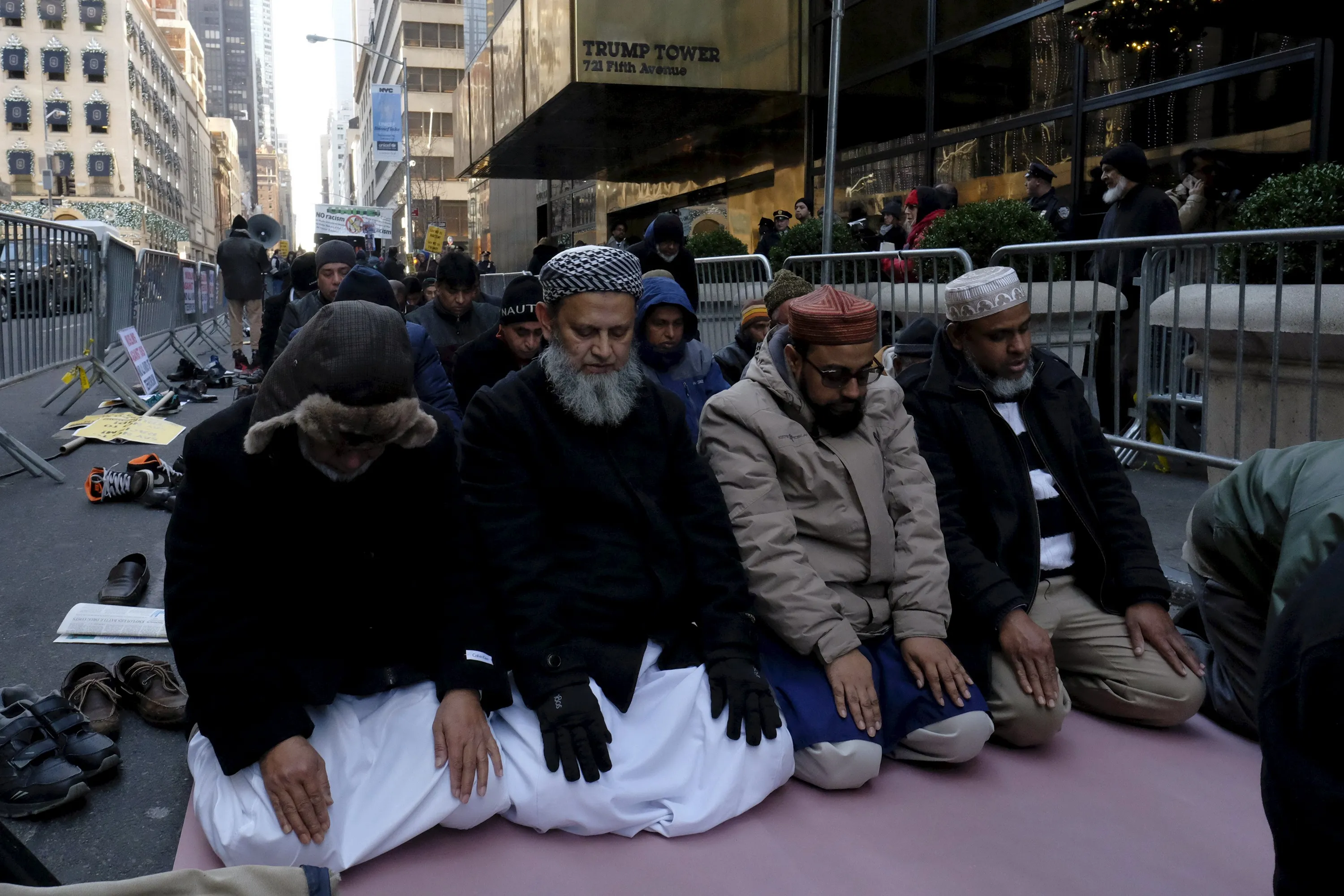 Muslims pray as they take part in a protest against presidential candidate Donald Trump outside of his office in Manhattan, New York December 20, 2015. (Photo by Eduardo Munoz/Reuters)
