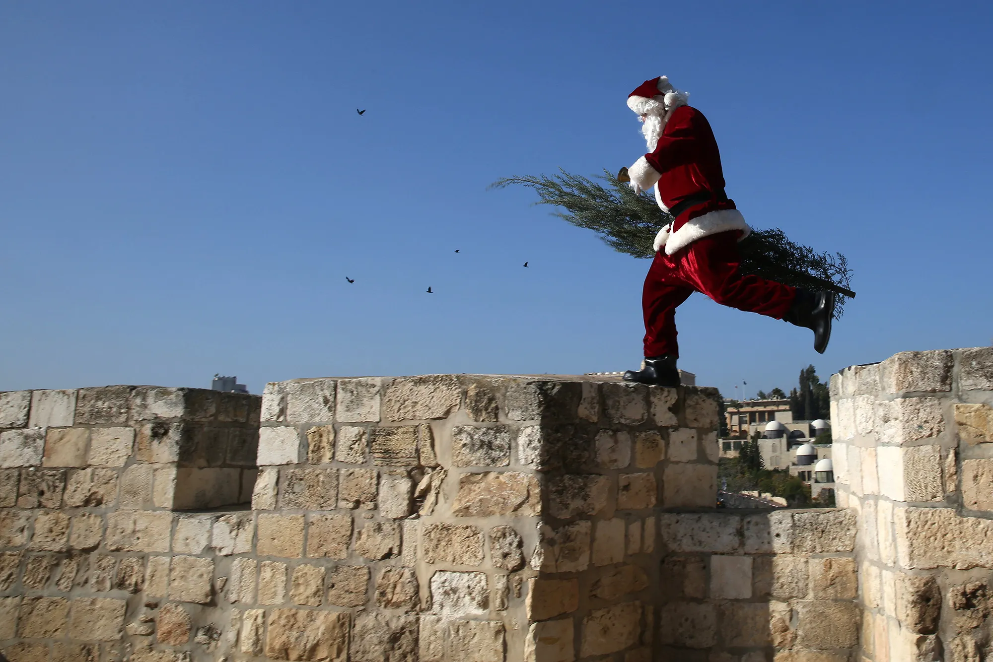 A Christian Palestinian man dressed up as Santa Claus walks carrying a Christmas tree along Jerusalem's Old City walls on December 21, 2015, as Christians around the world prepare to celebrate Christmas. (Photo by Gali Tibbon/AFP Photo)