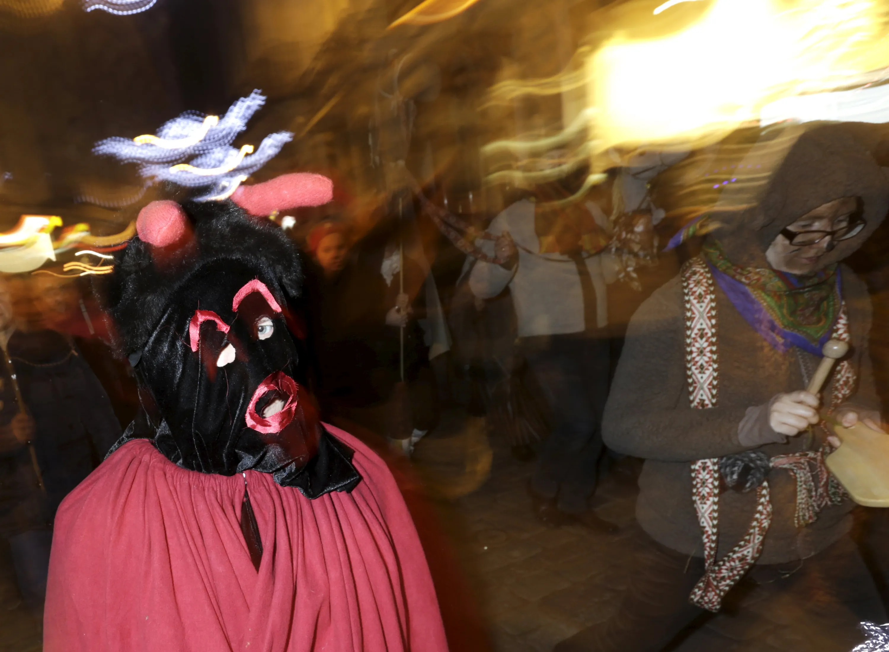 People wear costumes as they participate in the ancient Yule Log dragging tradition during winter solstice celebrations in Riga, Latvia, December 21, 2015. REUTERS/Ints Kalnins