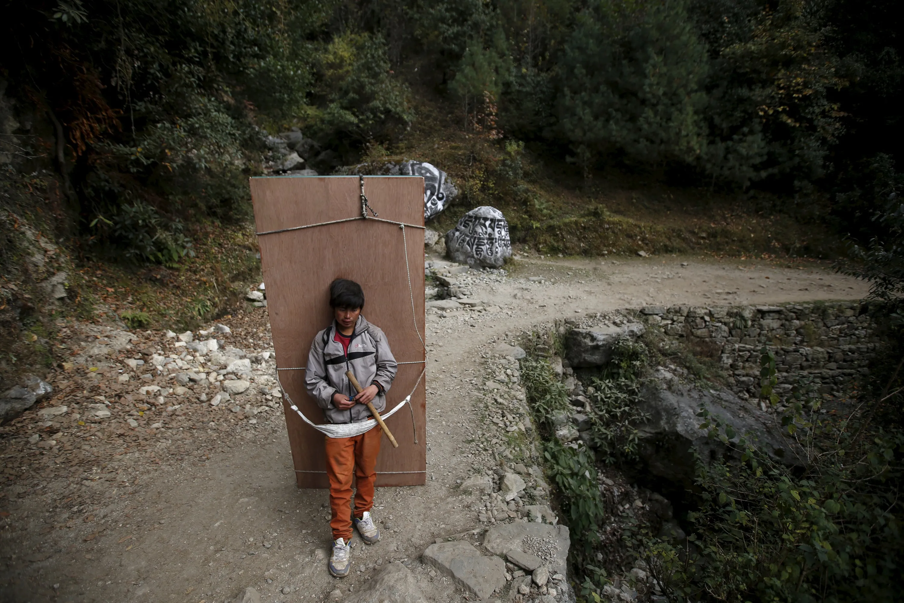 A porter takes a break as he carries plywood sheets used for building houses in Solukhumbu district, also known as the Everest region, in this picture taken November 28, 2015. (Photo by Navesh Chitrakar/Reuters)