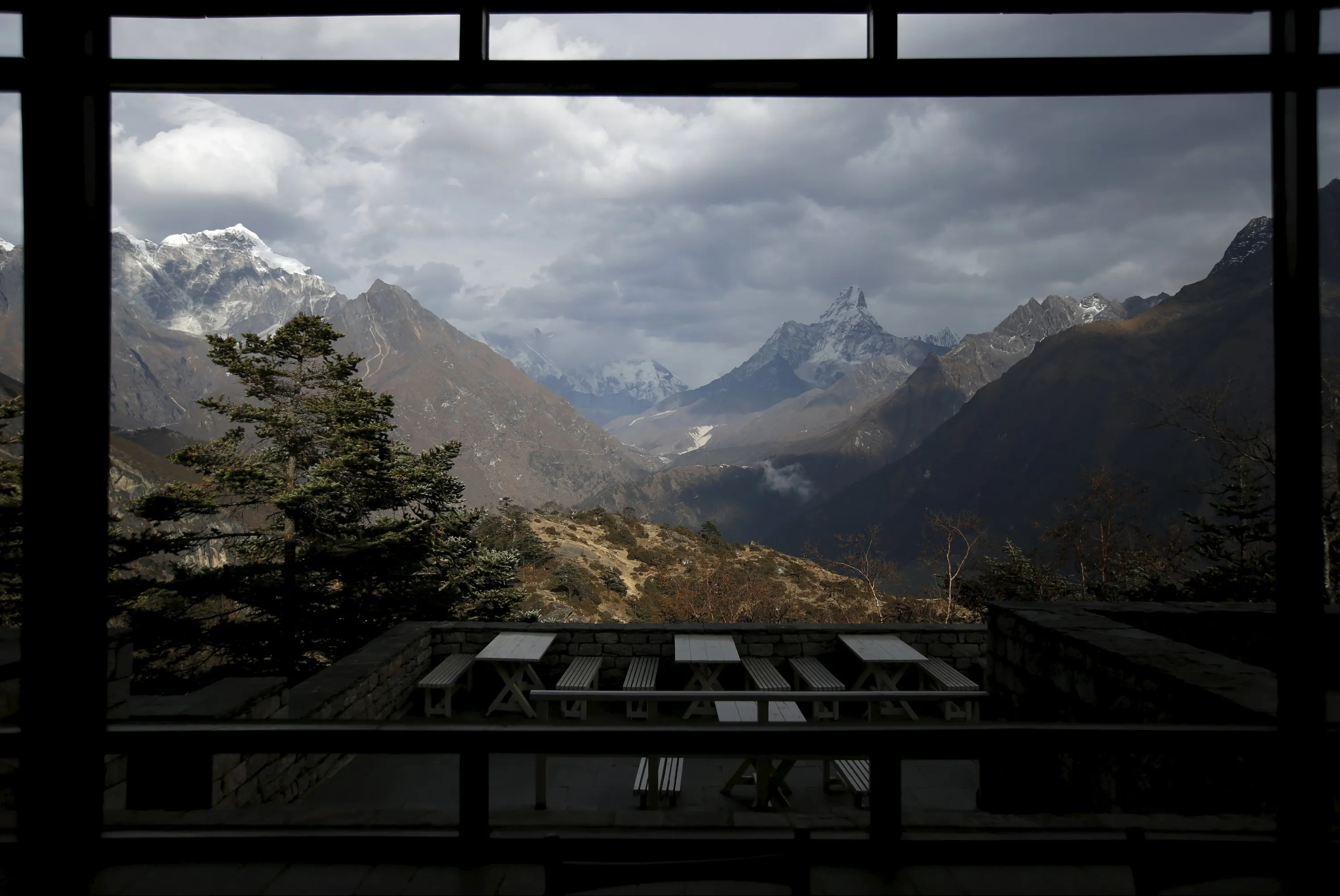 A view, through a window, of Mount Ama Dablam (R) is seen as Mount Everest (C) is covered with clouds, at an empty Everest view hotel in Solukhumbu district, also known as the Everest region, in this picture taken November 30, 2015. (Photo by Navesh Chitrakar/Reuters)