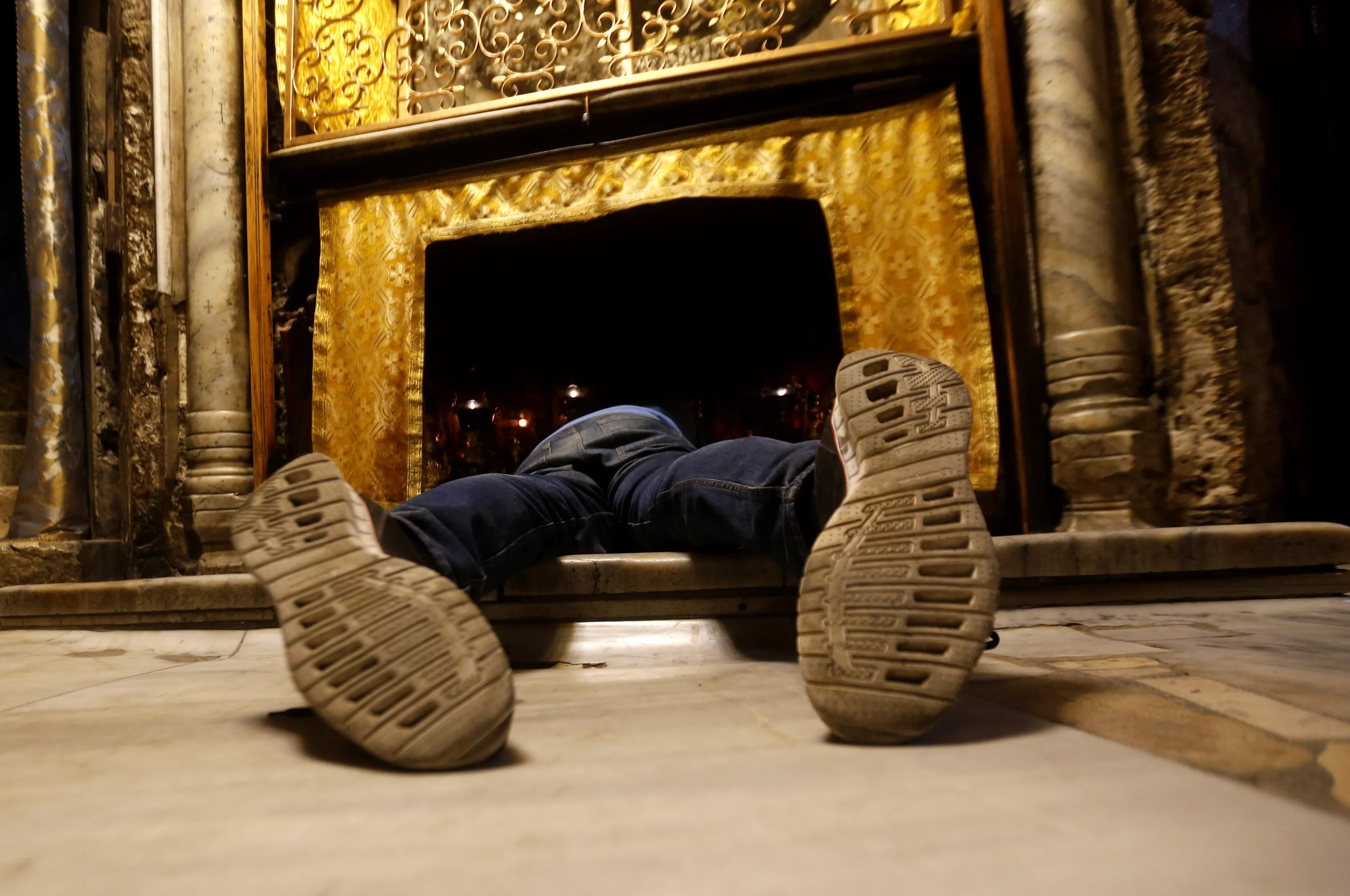 A Christian Orthodox Russian prays at the 14 pointed silver star marking the believed location of the birth of Christ, during a candlelight procession of prayer, in the West Bank city of Bethlehem, December 22, 2015. The church where Jesus was born, one of the world's oldest, is still undergoing massive reconstruction work, and is covered in white plastic sheets and scaffolding. (Photo by Abed Al Hashlamoun/EPA)