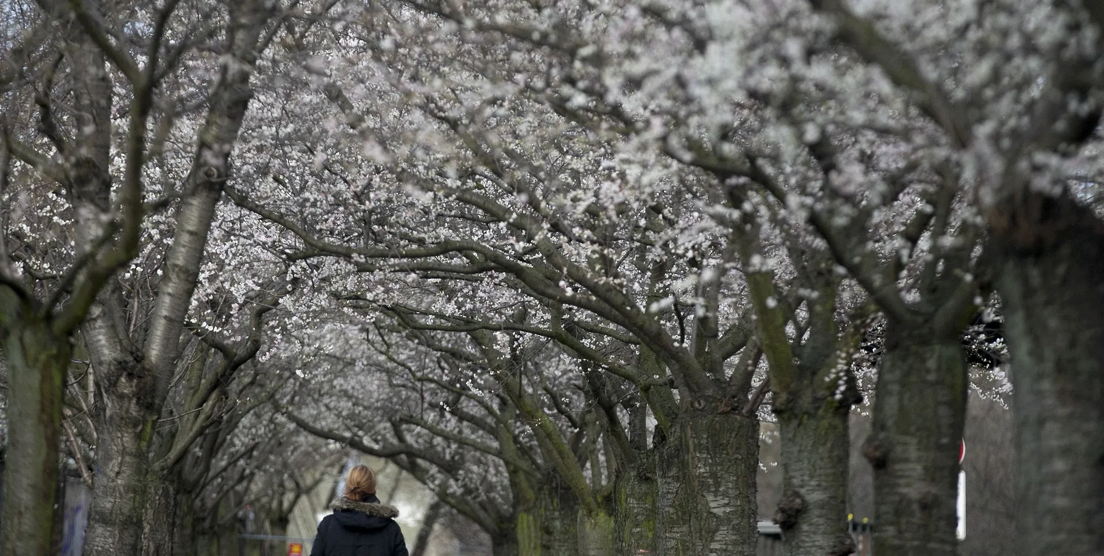 A woman walks under blooming cherry trees during winter time in Berlin, Germany, December 22, 2015. (Photo by Hannibal Hanschke/Reuters)