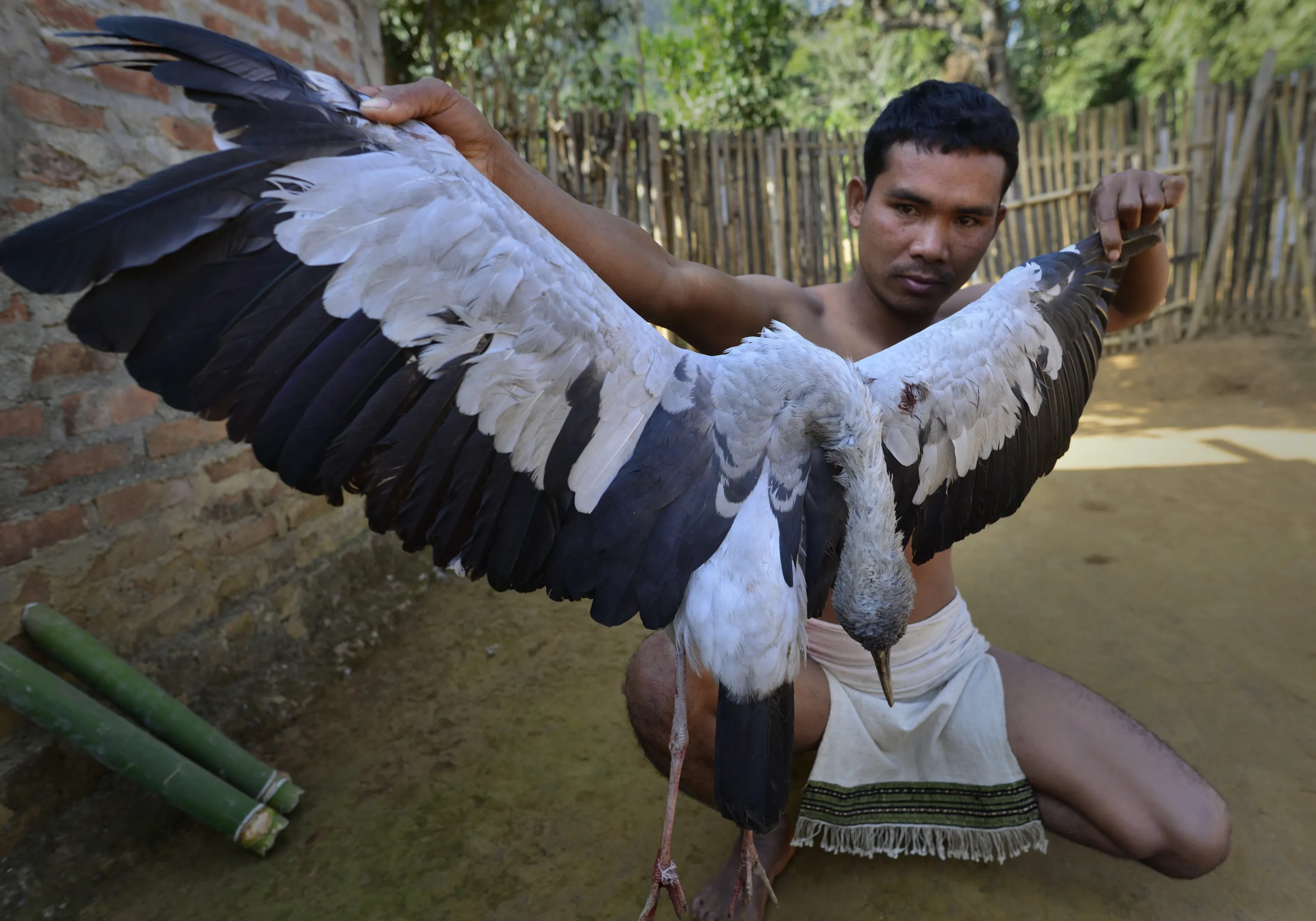 A picture made available on 22 December 2015 shows a Tiwa tribal hunter displaying his catch in the remote Karbi Anglong district of Assam state, India, 21 December 2015. As the harvesting season gets over, young men get engaged in hunting. Tiwa is a major tribe of Assam state who practice Jhum or shifting cultivation for their living in the hills. (Photo by EPA/Stringer)