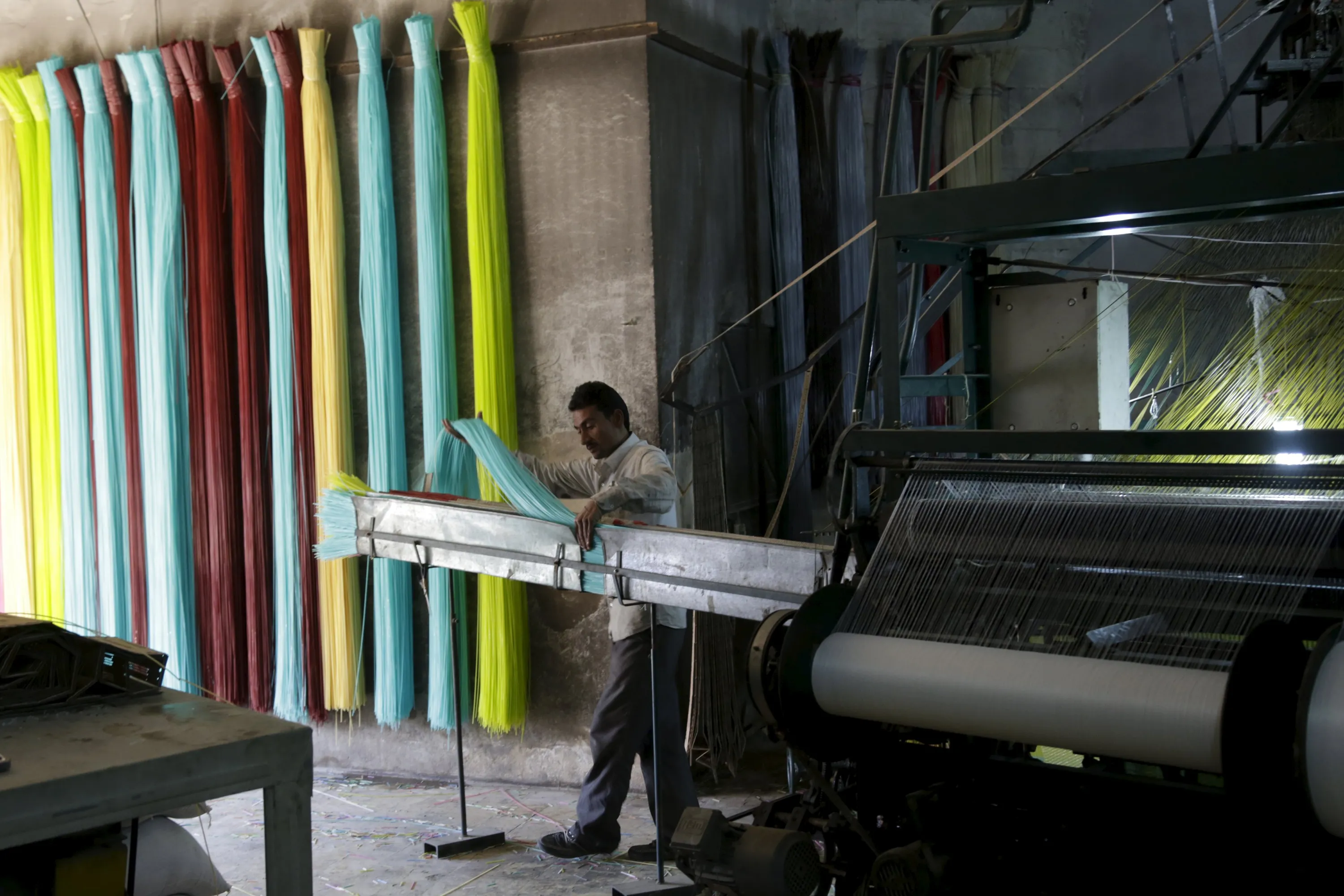 A man prepares plastic strings, used to produce mats, inside a mat factory in the rebel-controlled area of Maarshureen town in Idlib province, Syria, December 22, 2015. (Photo by Khalil Ashawi/Reuters)